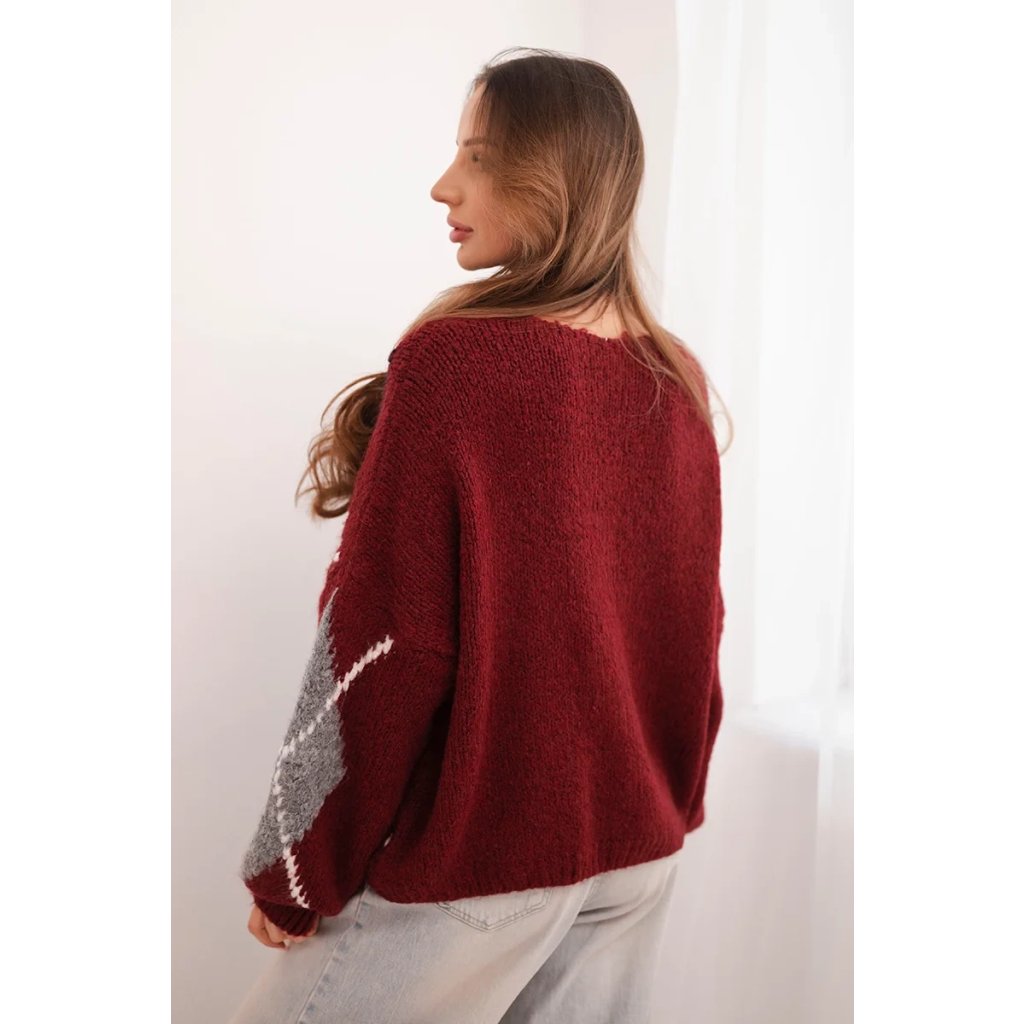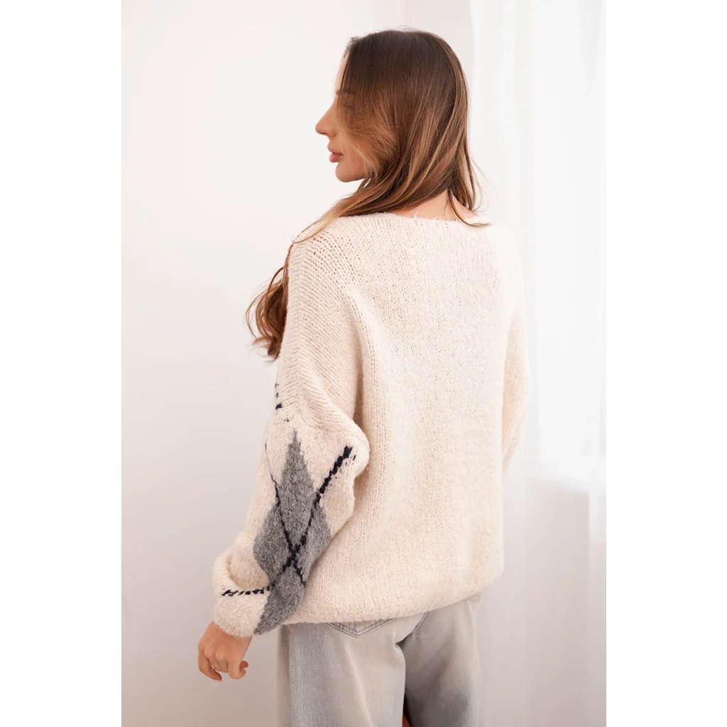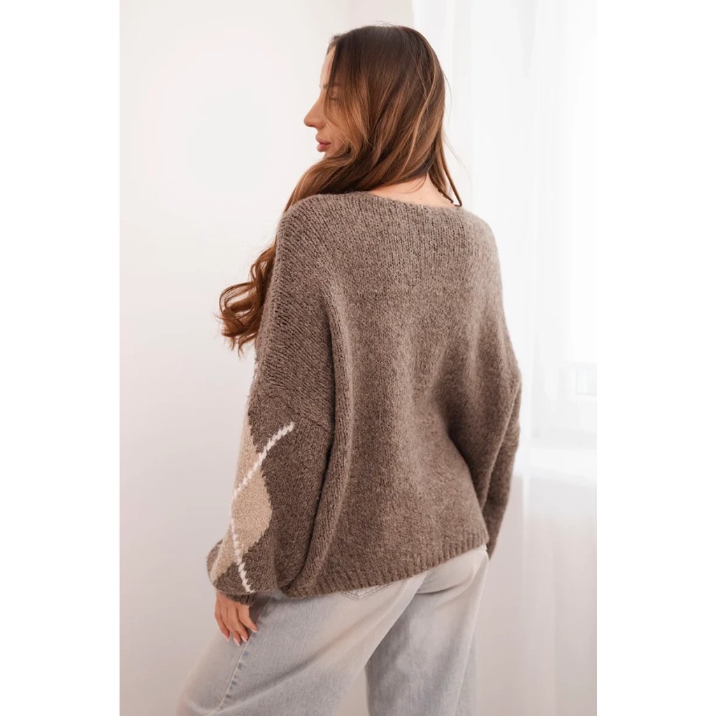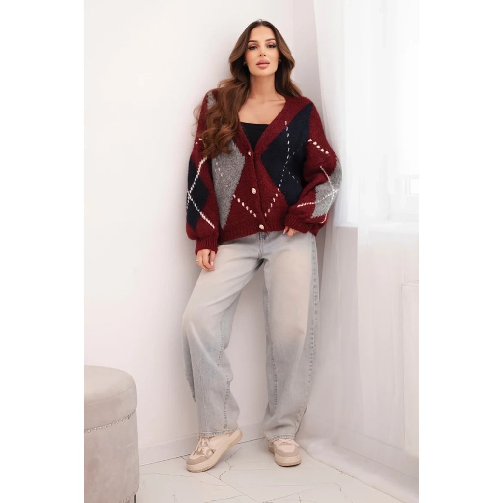 Stylový dámský kardigan v módním vzoru kosočtverců je must-have sezóny podzim–zima. Volný, oversized střih s hlubokým výstřihem do V dodává siluetě lehkost a volnost. Zapínání na dekorativní knoflíky přidává eleganci, a teplý, měkký materiál dělá z něj ideální volbu na chladné dny. Kardigan se skvěle kombinuje jak s džíny, tak s sukněmi, a hodí se do každodenních a casualových stylizací. Velké kosočtverce mu dodávají originální a nadčasový vzhled.
