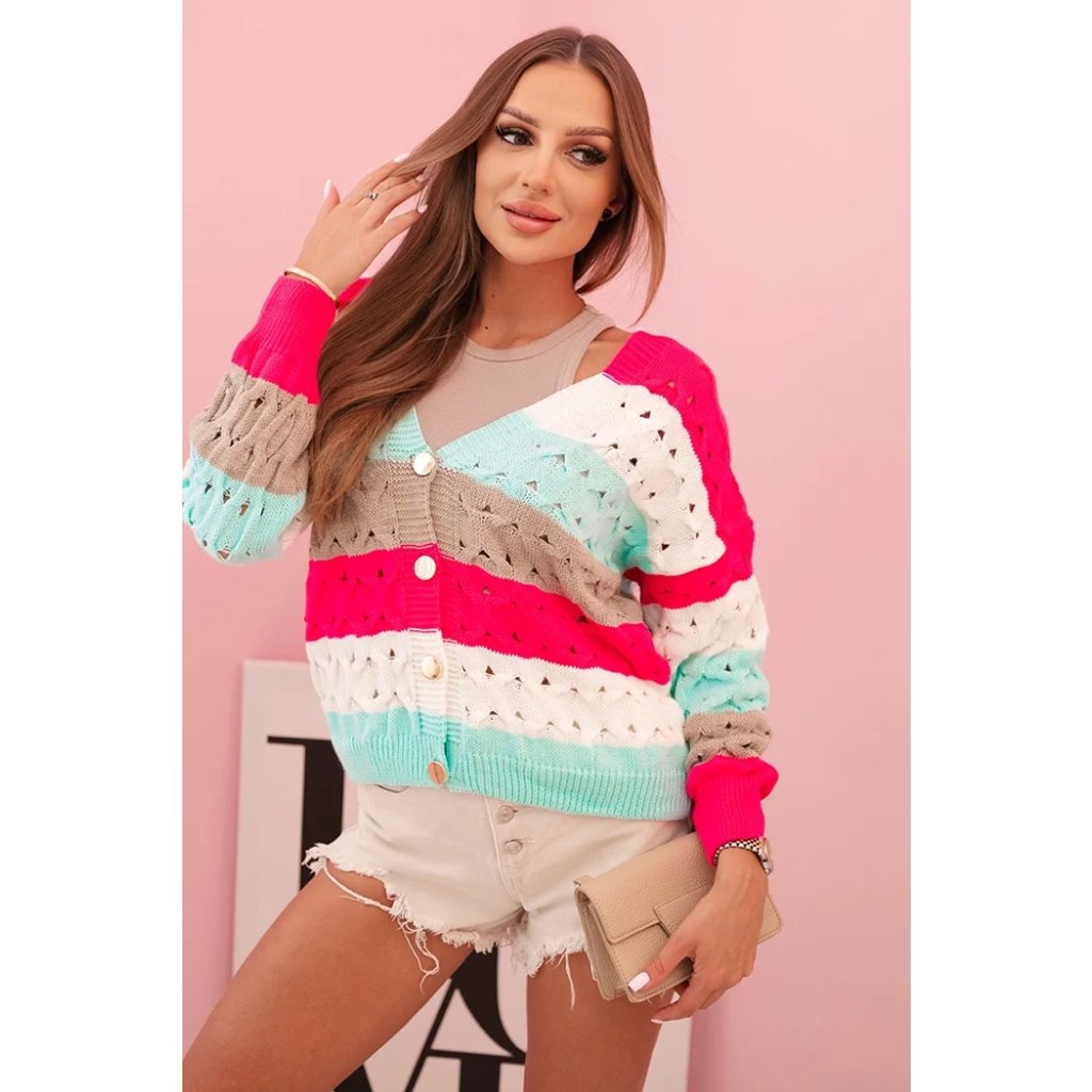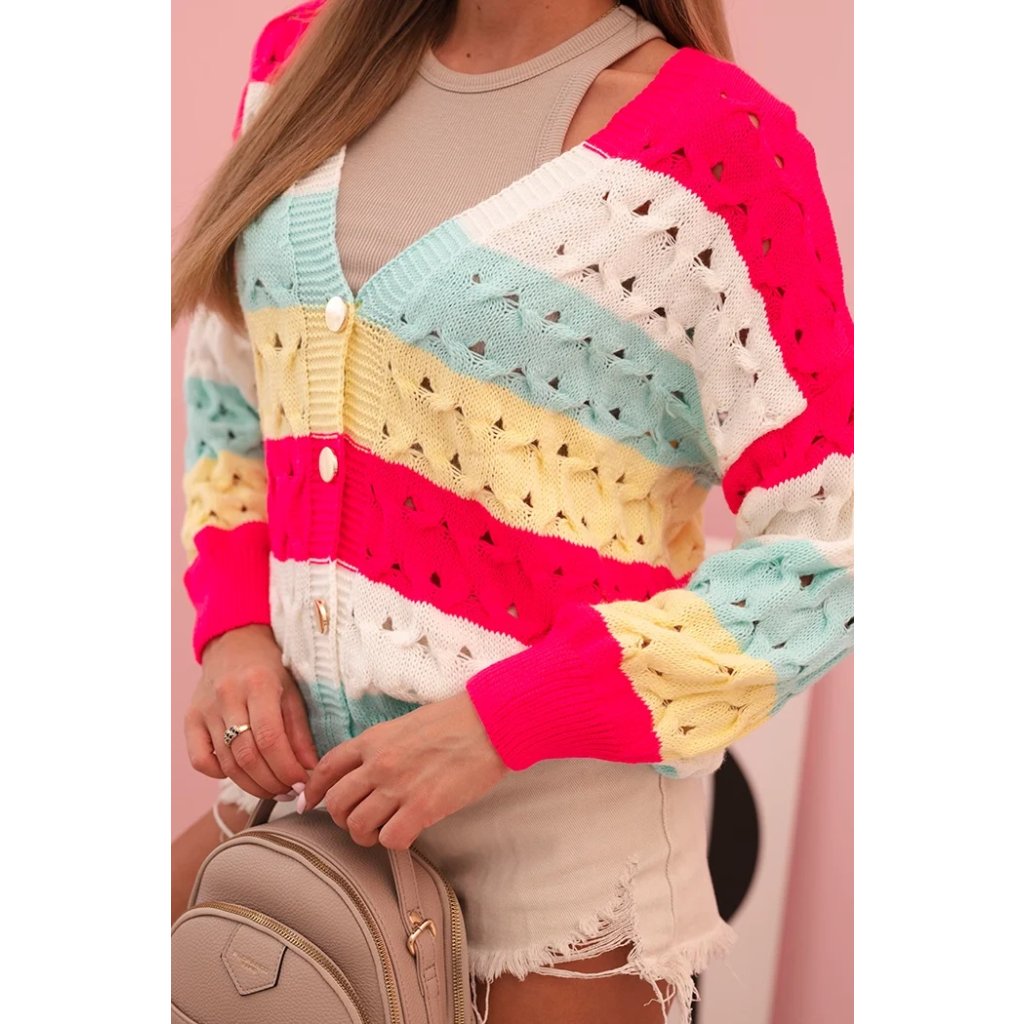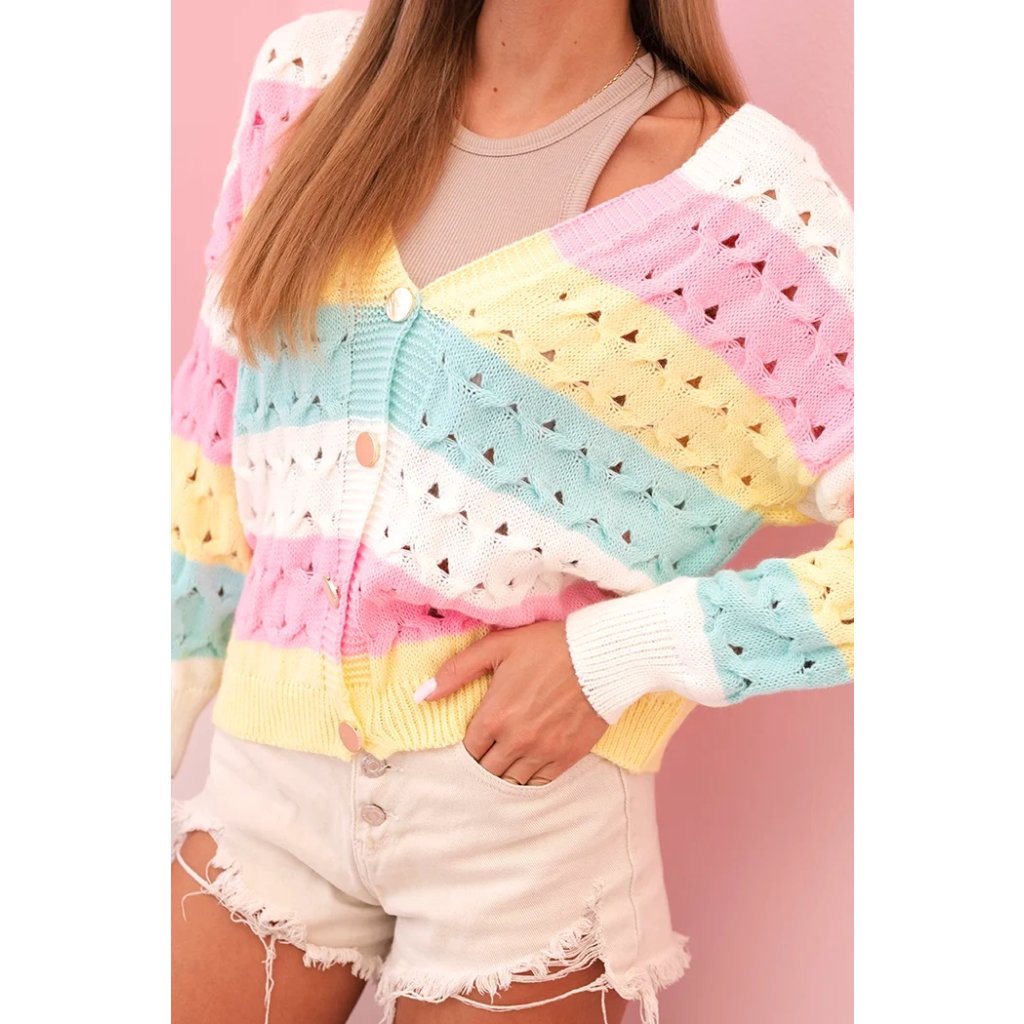 Tento kouzelný dámský cardigan s barevnými pruhy je ideální nabídkou na každé roční období. Vyrobený z měkkého, příjemného akrylu, skvěle se hodí jak na chladnější dny, tak jako stylový doplněk jarních outfitů. Krajkový vzor mu dodává lehkost a ženské kouzlo, a klasický výstřih do V krásně zvýrazňuje krk. Cardigan je zapínaný na knoflíky, což mu dodává praktičnost a umožňuje ho nosit mnoha způsoby – jak rozepnutý, tak zapnutý. Je to vynikající volba pro ženy, které si cení pohodlí, barev a módního vzhledu. Díky pastelovým barvám ho snadno sladíte s mnoha outfity – od casual po romantické kombinace. Skvěle vypadá s džíny, sukní nebo šaty. Velikost je univerzální a bude vhodná pro dámy ve velikosti S, M nebo L.