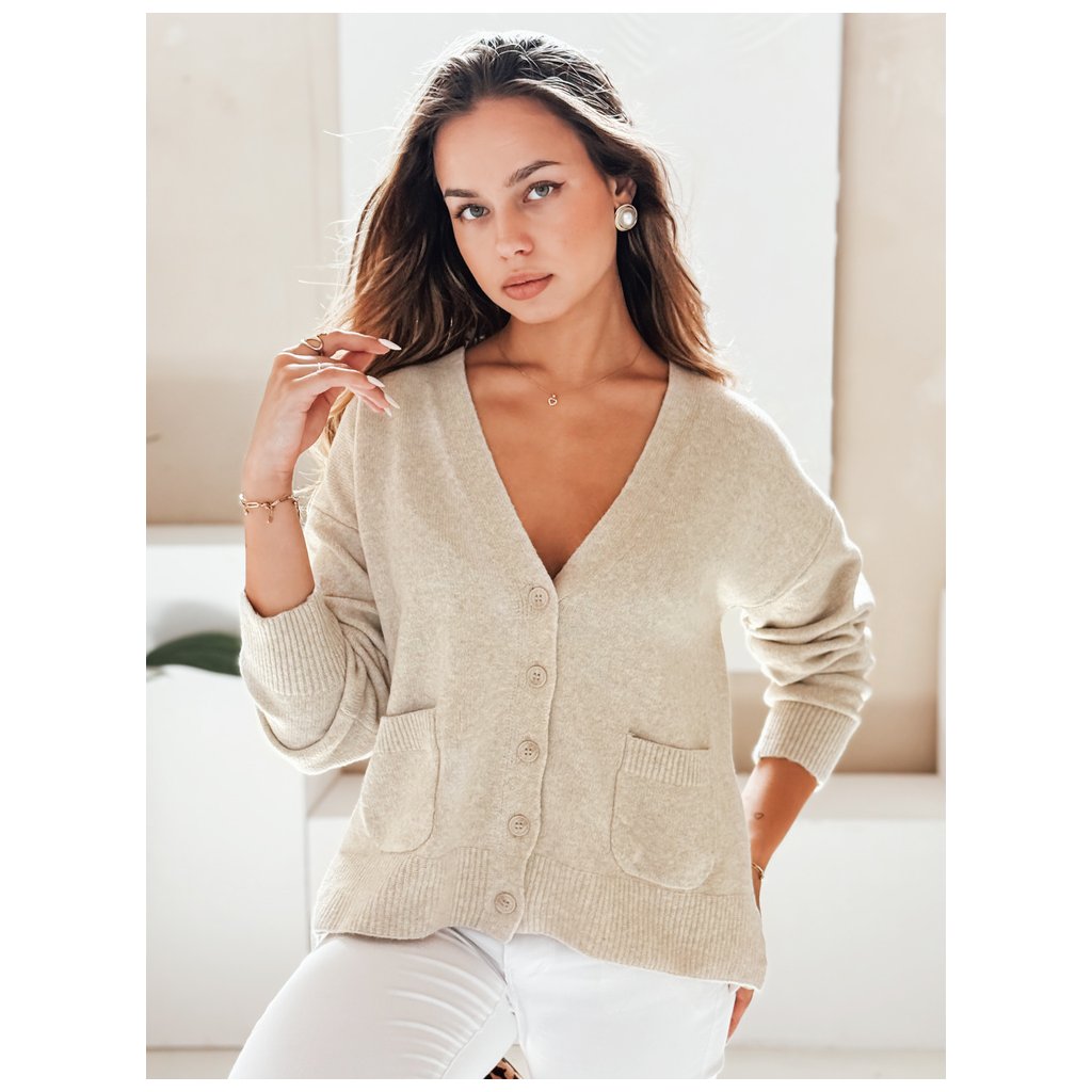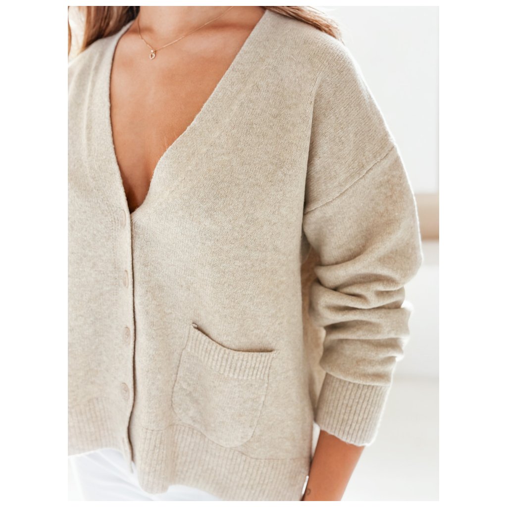 Klasický kardigan volnějšího střihu, ideální pro chladnější dny a všestranný styling. SORELIE kombinuje pohodlí úpletu s praktickými detaily, jako jsou kapsy a výstřih do V. Hodí se jak k ležérním, tak k rafinovanějším outfitům.