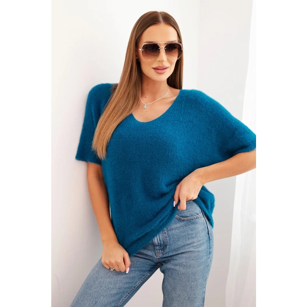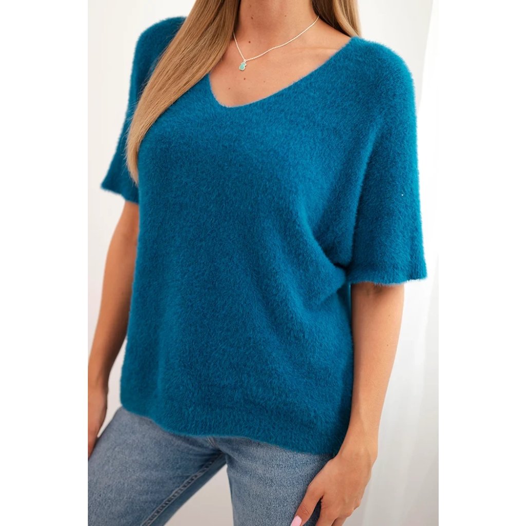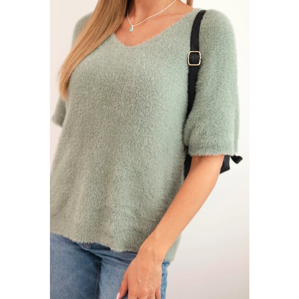 Dámský svetr z měkkého chlupatého materiálu s V výstřihem krátký rukáv