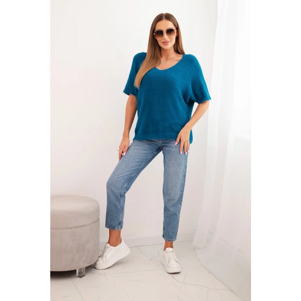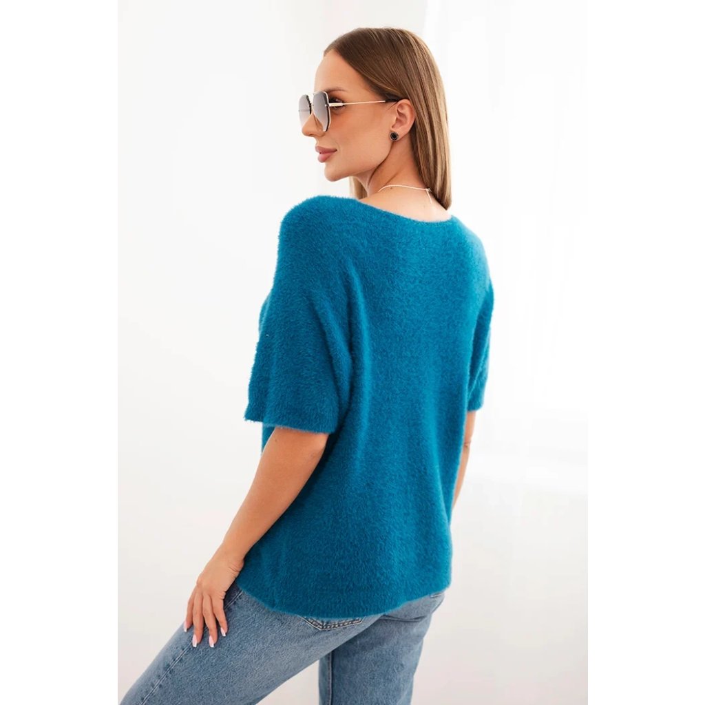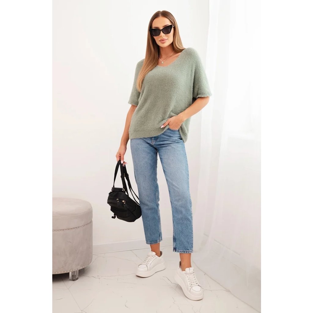 Dámský svetr z měkkého chlupatého materiálu s V výstřihem krátký rukáv