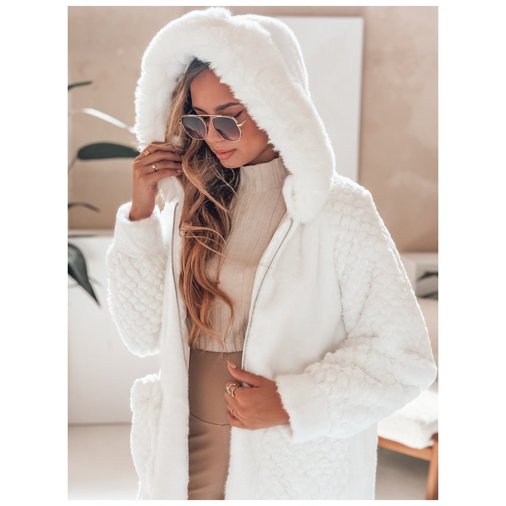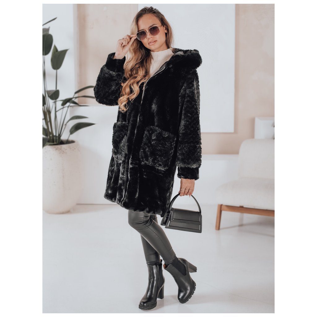 Stylová dámská kožichová bunda s kapucí a velkými kapsami. Délka do poloviny stehen, pohodlný lem a zip po celé délce poskytují pohodlí a ochranu před chladem. Módní volba na podzim a zimu, ideální pro elegantní a městský vzhled.