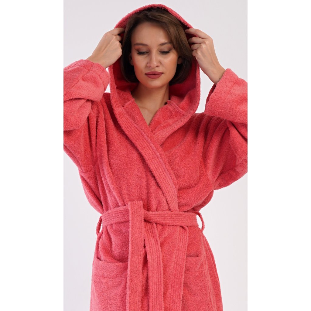 Dámský bavlněný froté župan s kapucí Jahoda. Dámský dlouhý župan s kapucí a páskem ke stažení je vhodný po koupeli i na povalování se doma na gauči. Froté župan má praktické kapsy, které oceníte při návštěvě wellness. Použitý bavlněný materiál je příjemný a poddajný na dotek.
