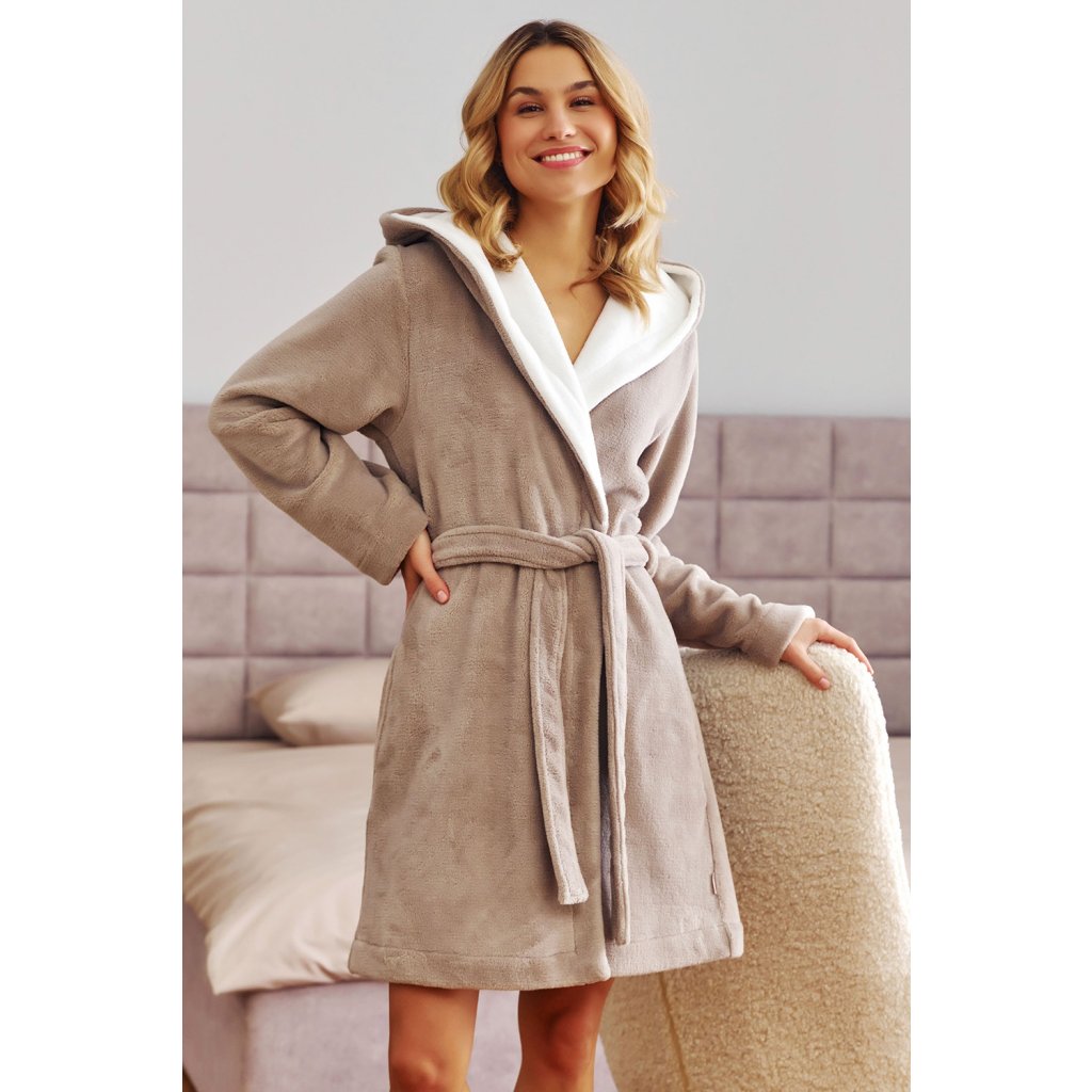 Elegantní zavinovací župan s kapucí.Dlouhé rukávy