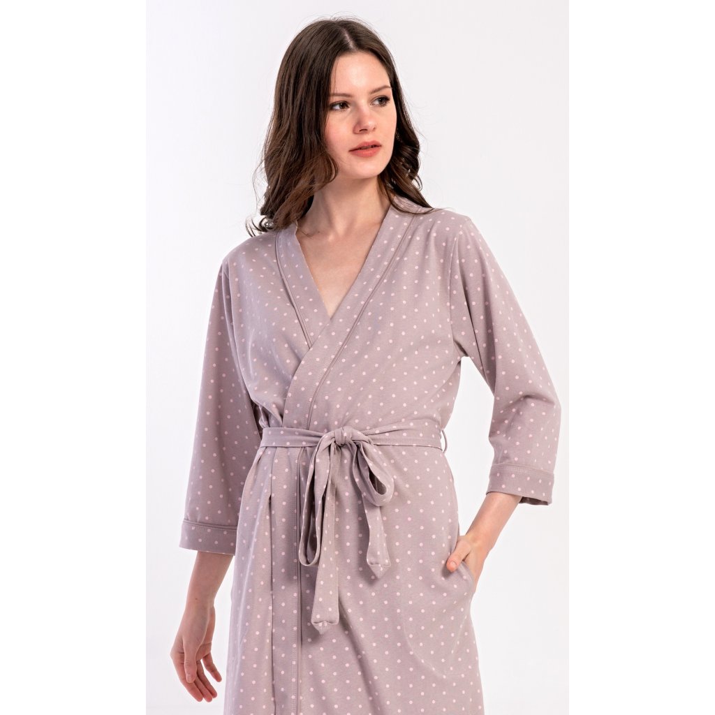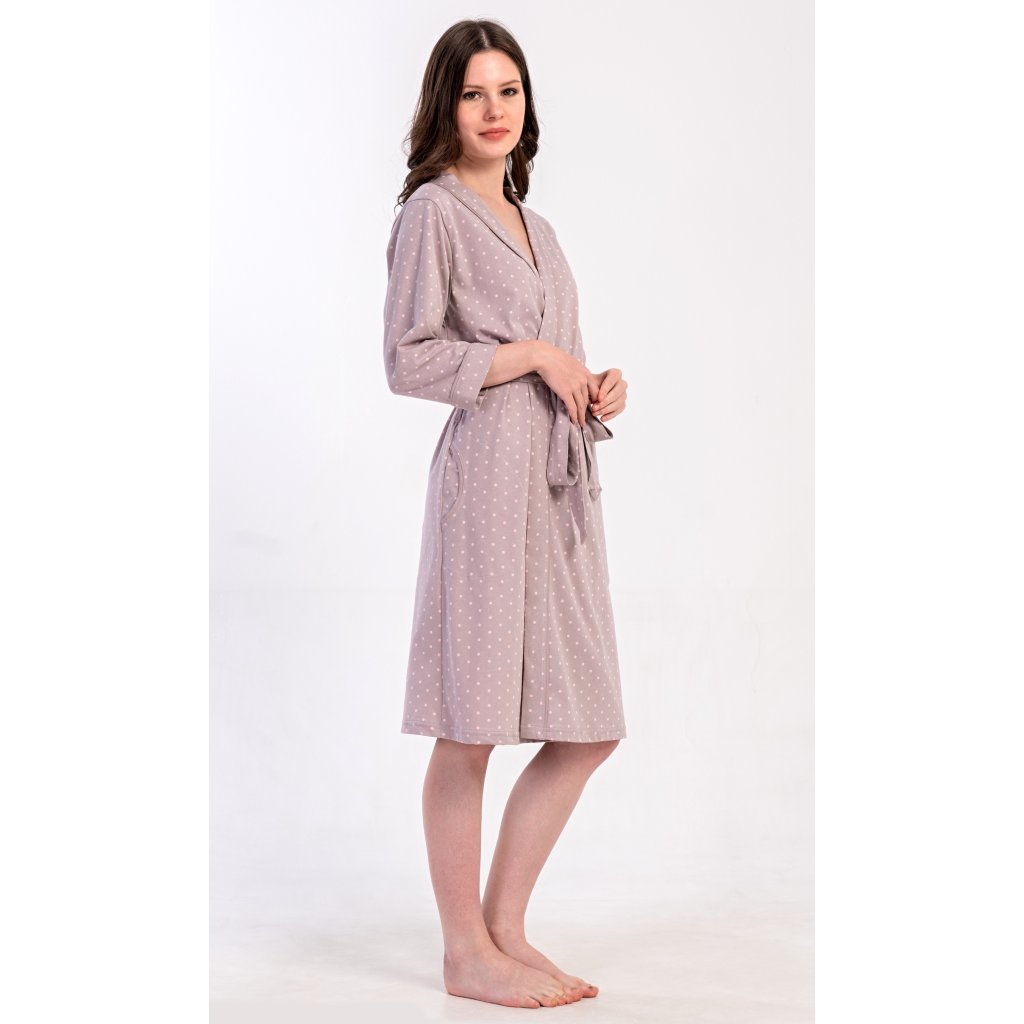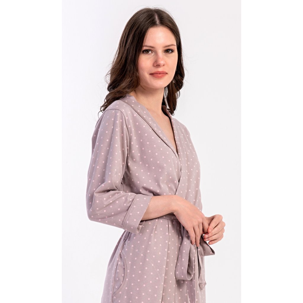 Dámský krátký bavlněný župan Adélka. Dámský župánek s tříčtvrtečním rukávem a délkou pod kolena je potišten drobnými puntíky. Župan má pásek ke stažení a praktické kapsy. Použitý bavlněný materiál je příjemný a poddajný na dotek, saje a oceníte ho i po koupeli.