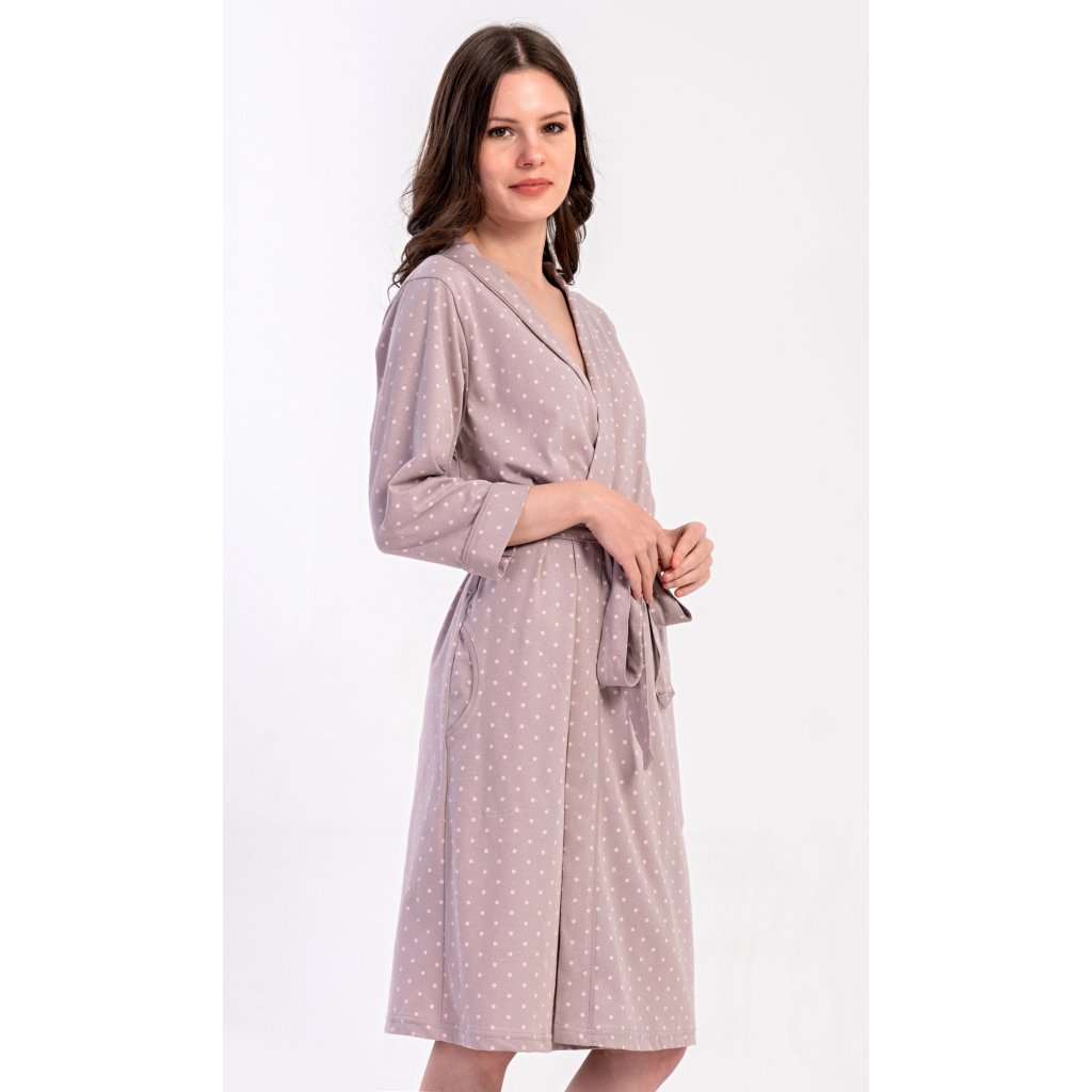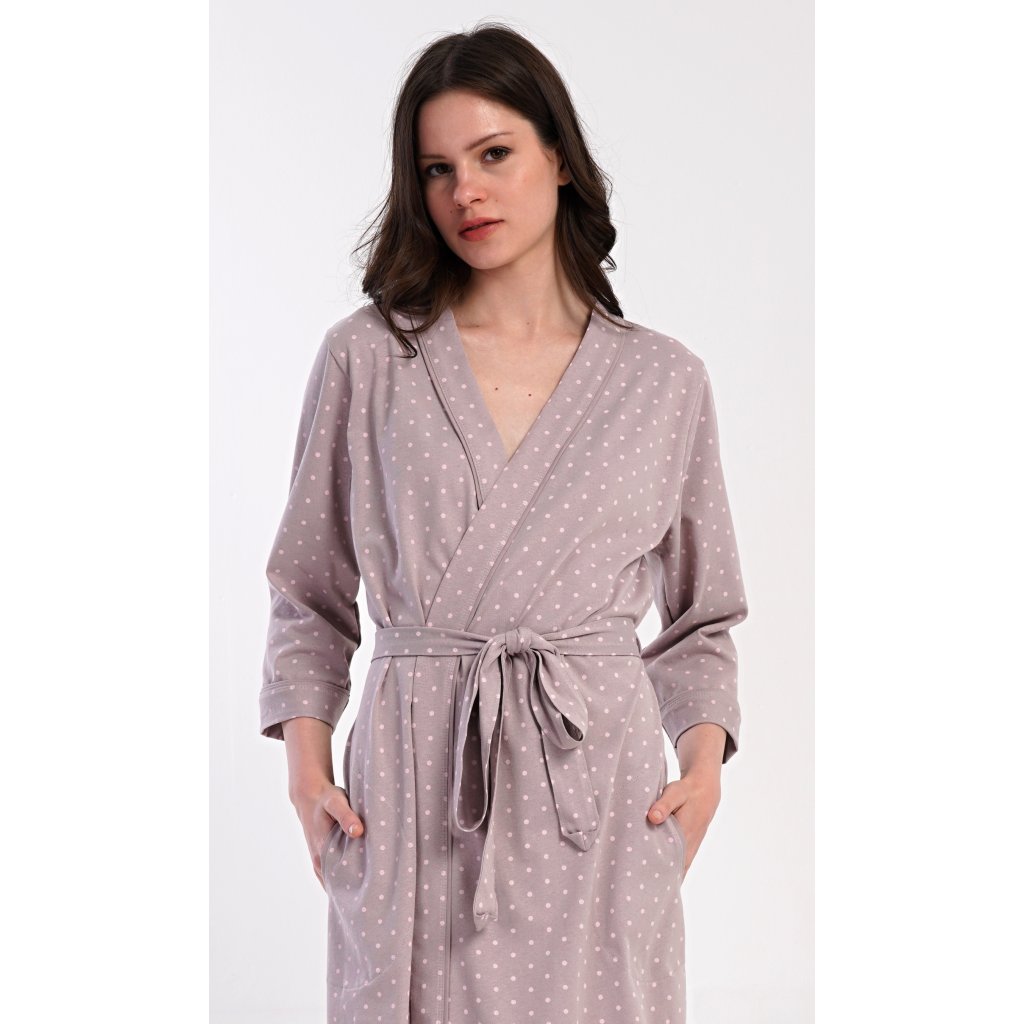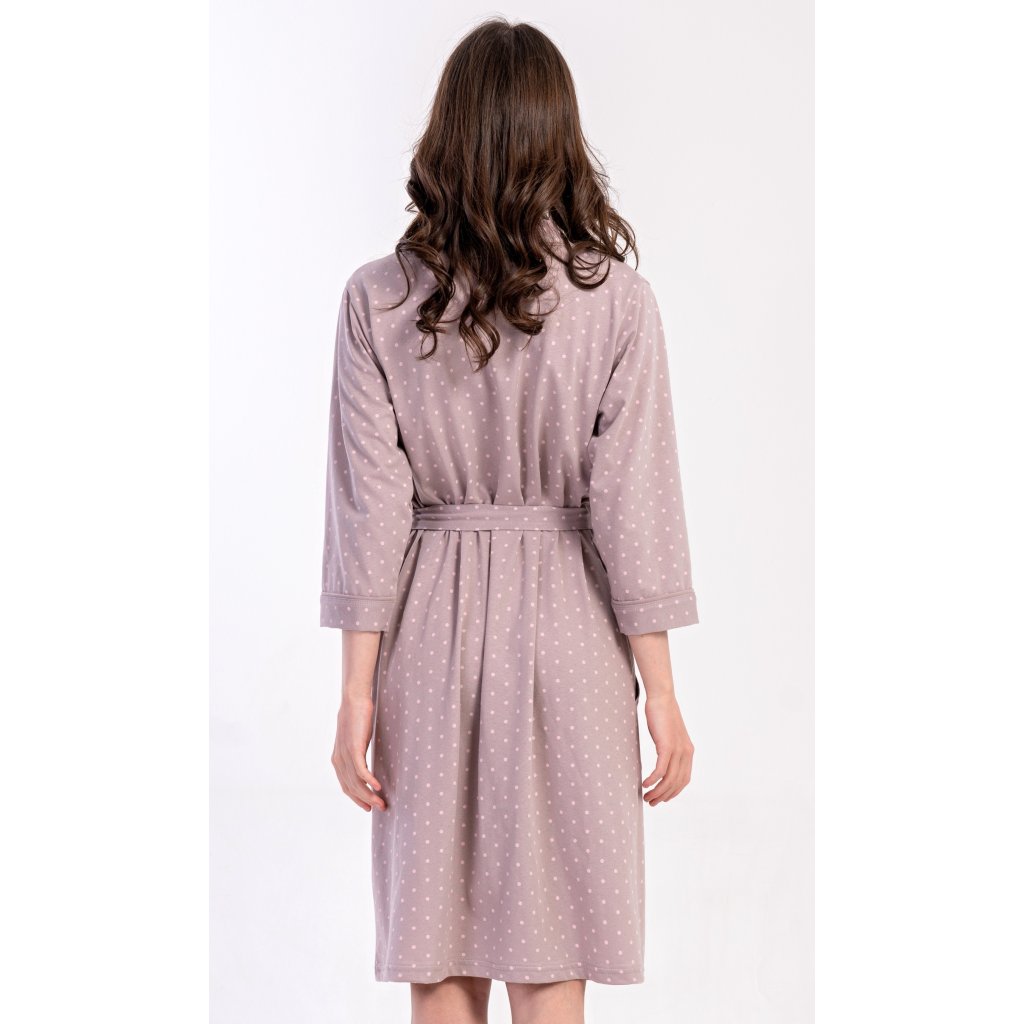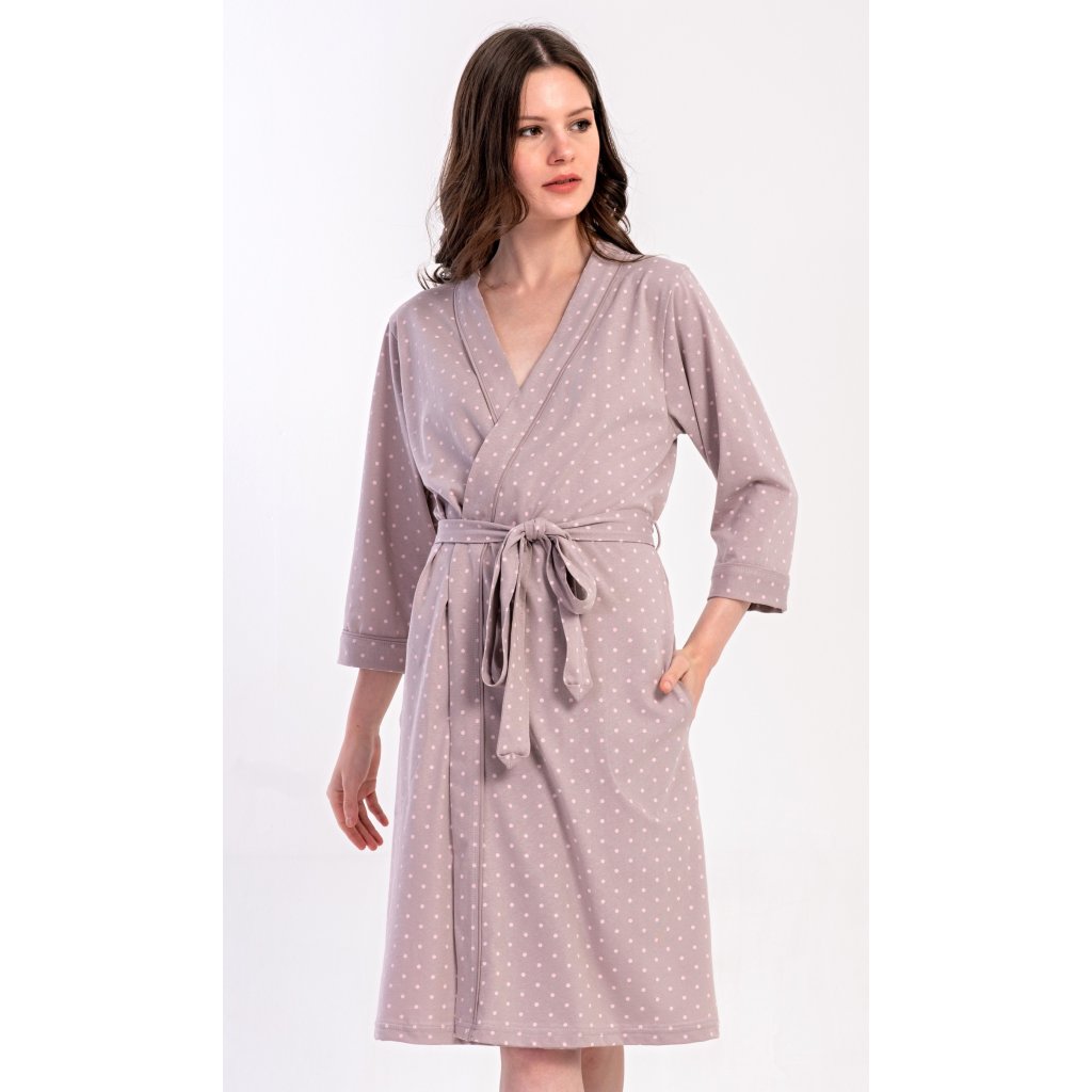 Dámský krátký bavlněný župan Adélka. Dámský župánek s tříčtvrtečním rukávem a délkou pod kolena je potišten drobnými puntíky. Župan má pásek ke stažení a praktické kapsy. Použitý bavlněný materiál je příjemný a poddajný na dotek, saje a oceníte ho i po koupeli.