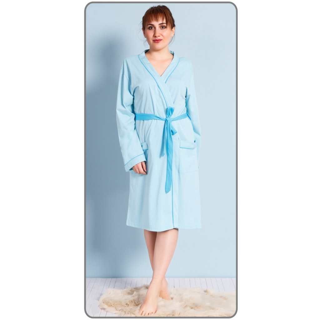 Dámský bavlněný župan krátký Mariana. Župan s délkou pod kolena má dlouhý rukáv, výstřih je olemován barevnou stužkou a zavazuje se na barevný pásek. Na předním díle jsou našité dvě kapsy.