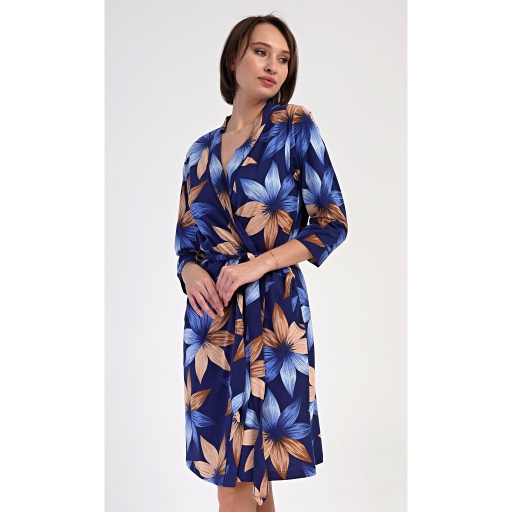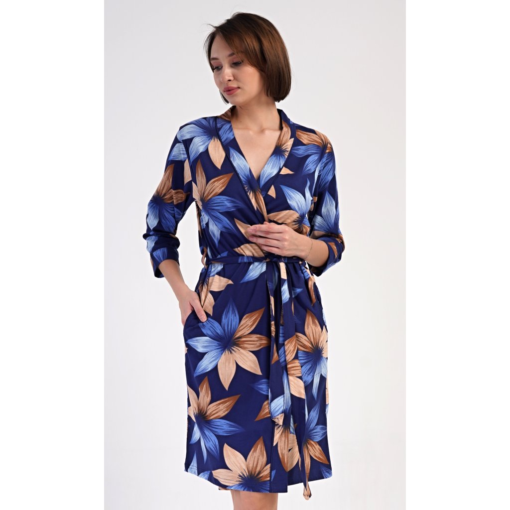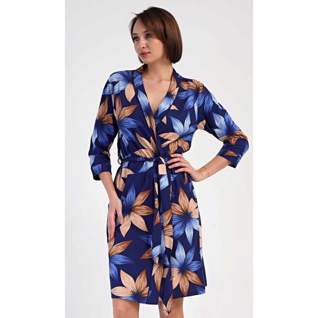Dámský krátký bavlněný župan Sarah. Dámský župánek v délce pod kolena je potišten výraznými květy. Župan má pásek ke stažení a praktické kapsy. Použitý bavlněný materiál je příjemný a poddajný na dotek, saje a oceníte ho i po koupeli.