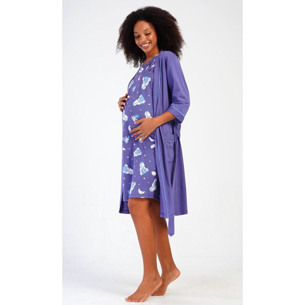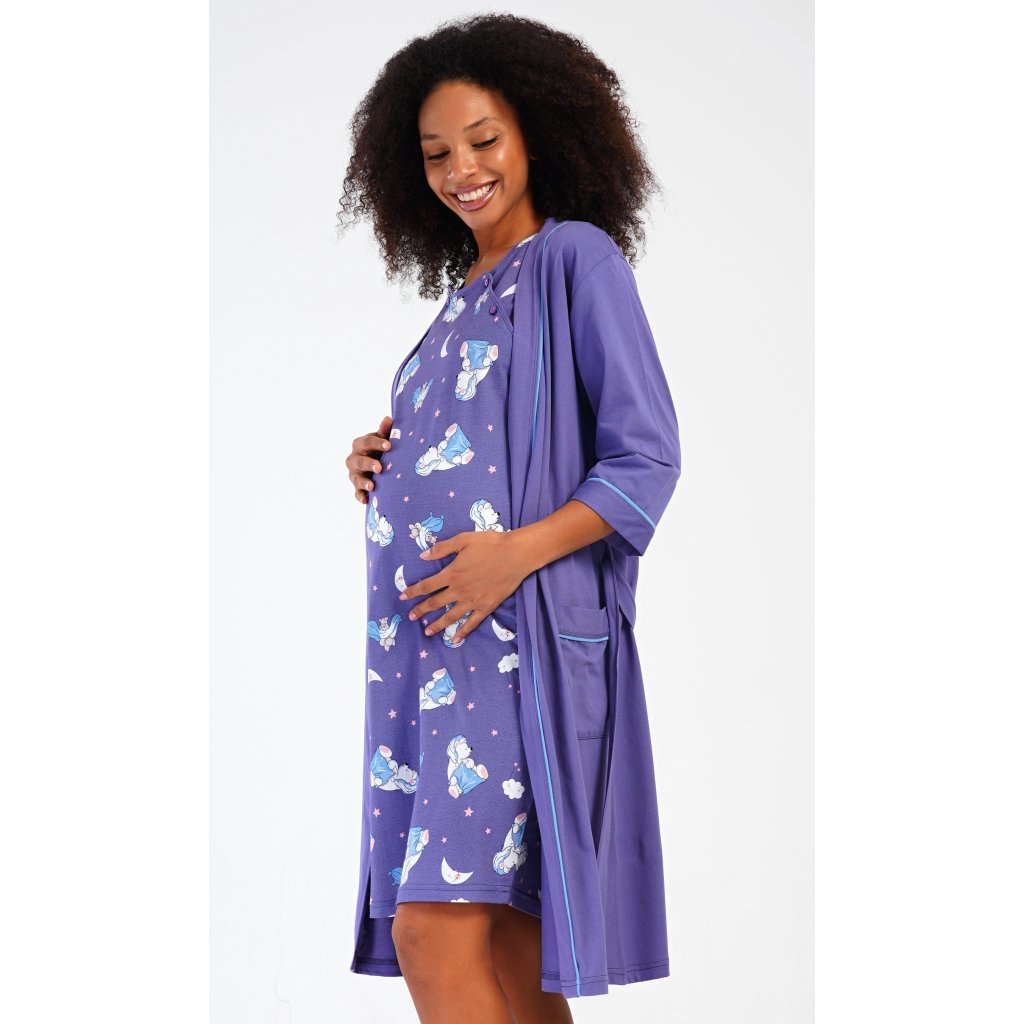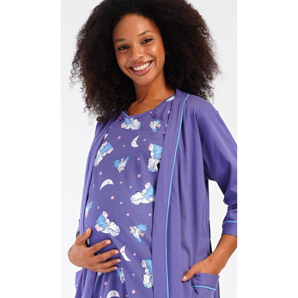 Dámský bavlněný župan s mateřskou košilí Méďa. Komplet se skládá z bavlněného županu a noční košile, která je svým střihem určena na dobu těhotenství, do porodnice, i na dobu kojení. Ke kojení slouží průstřihy na prsou uzavíratelné na knoflíky. Košile je potištěna obrázky ledních medvědů. Župan je jednobarevný, s tříčtvrtečními rukávy. Oceníte praktické kapsy a pásek na převázání. Kapsy, rukávy a vnitřní lem županu jsou ozdobeny modrou lemovkou. Použitý bavlněný materiál je příjemný a poddajný na dotek.