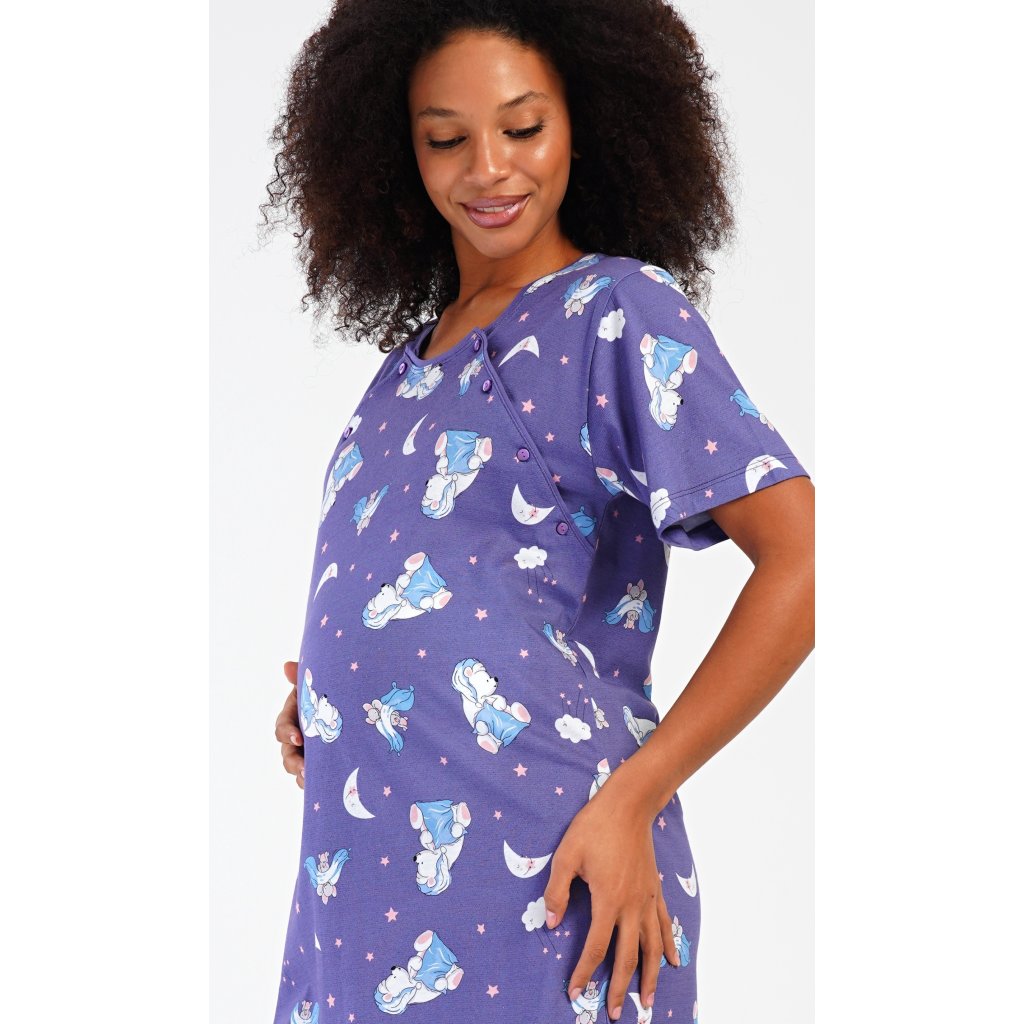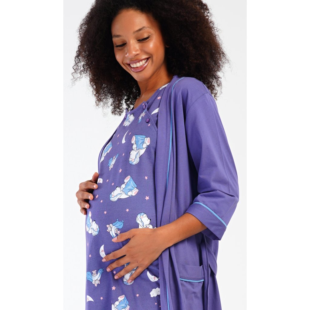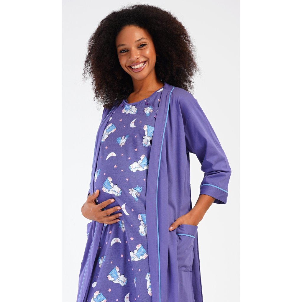 Dámský bavlněný župan s mateřskou košilí Méďa. Komplet se skládá z bavlněného županu a noční košile, která je svým střihem určena na dobu těhotenství, do porodnice, i na dobu kojení. Ke kojení slouží průstřihy na prsou uzavíratelné na knoflíky. Košile je potištěna obrázky ledních medvědů. Župan je jednobarevný, s tříčtvrtečními rukávy. Oceníte praktické kapsy a pásek na převázání. Kapsy, rukávy a vnitřní lem županu jsou ozdobeny modrou lemovkou. Použitý bavlněný materiál je příjemný a poddajný na dotek.