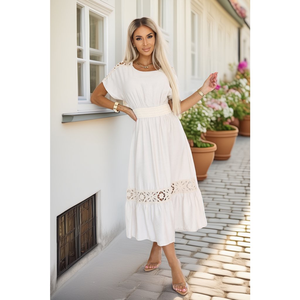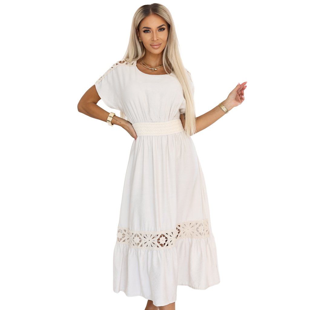 Decentní boho šaty s prolamovanými vsadkami - ecru 618-1