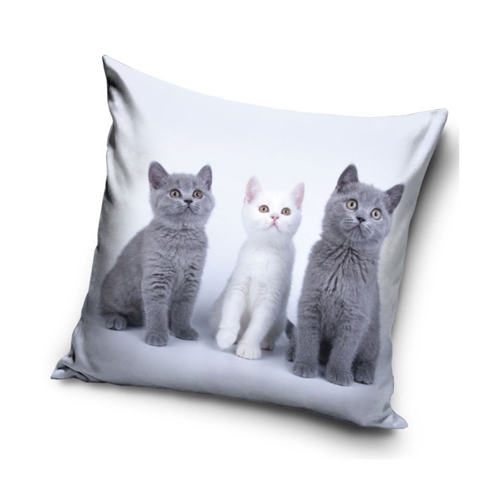 Dekorační polštářek Kočičí Trio, má rozměr 40x40 cm