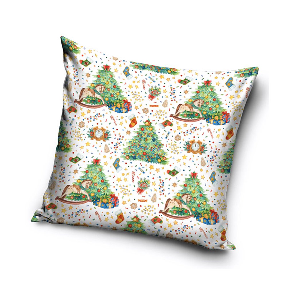 Polštářek plný krásných vánočních stromečků, dárečků a vánočních motivů, které vás přenesou do starších dob