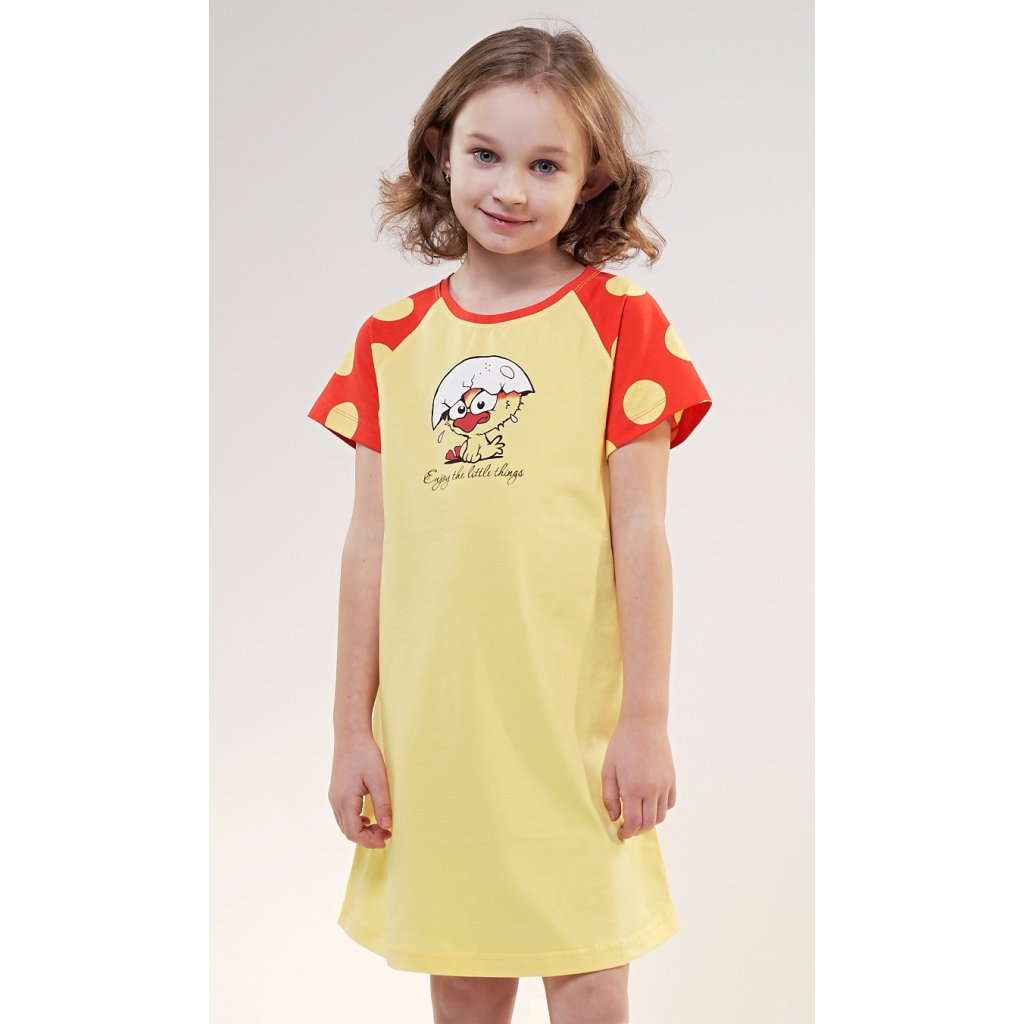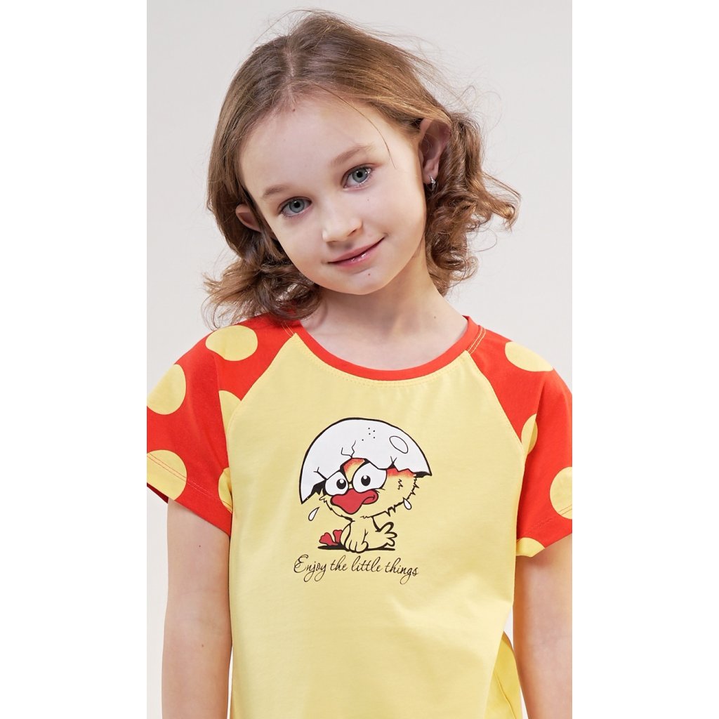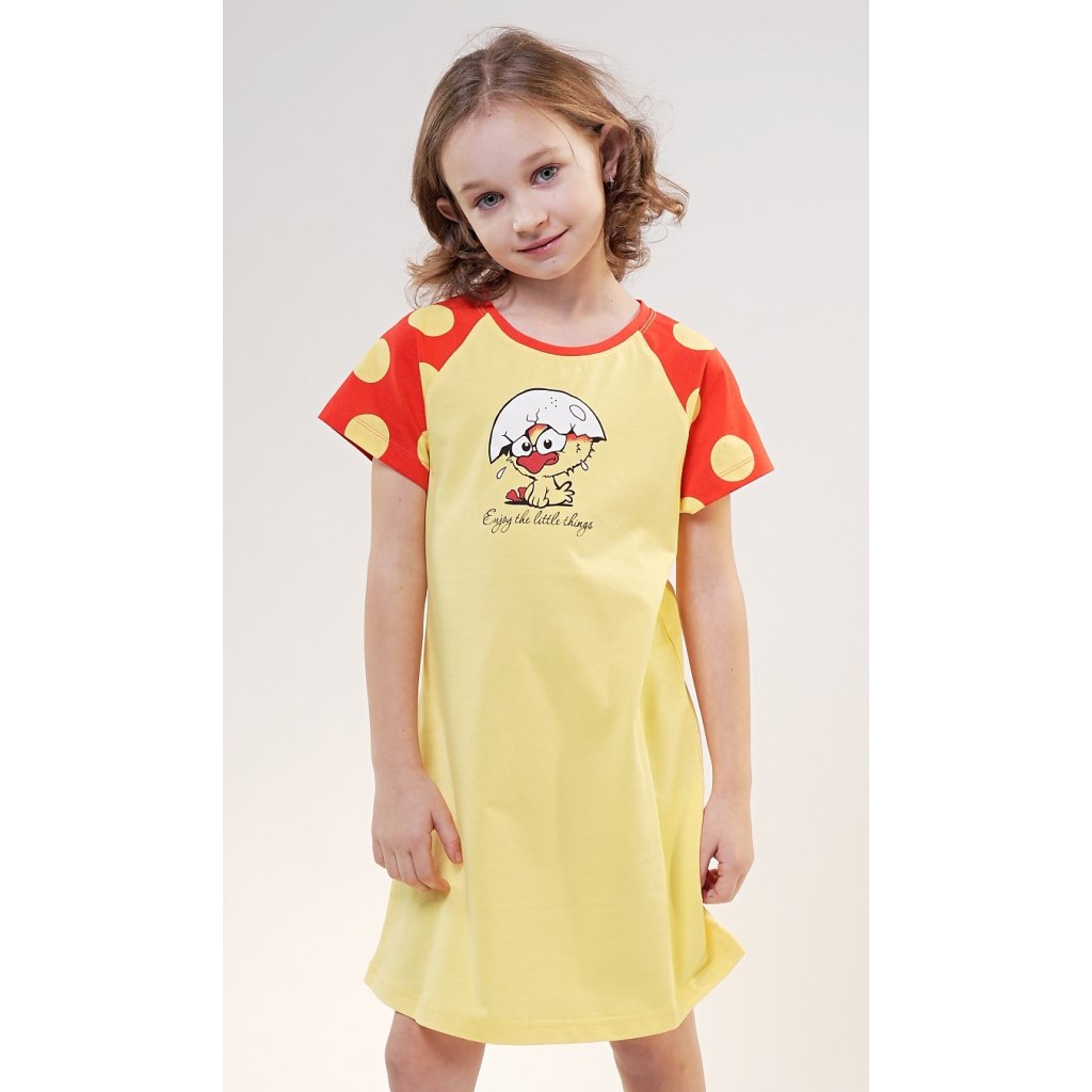 Dětská bavlněná noční košile s krátkým rukávem Kuře. Noční košilka má rukávky s velkými barevnými puntíky, na jednobarevném podkladu košile je obrázek roztomilého kuřátka se skořápkou na hlavě, pod kterým je nápis 'Enjoy the little things'. Použitý bavlněný materiál je příjemný a poddajný na dotek.