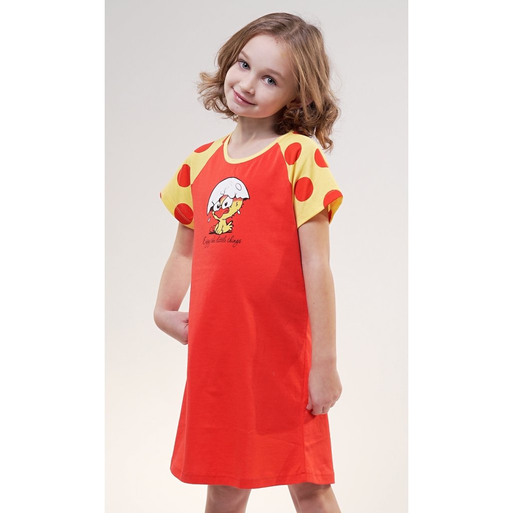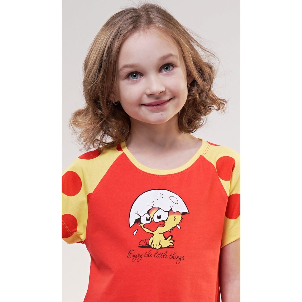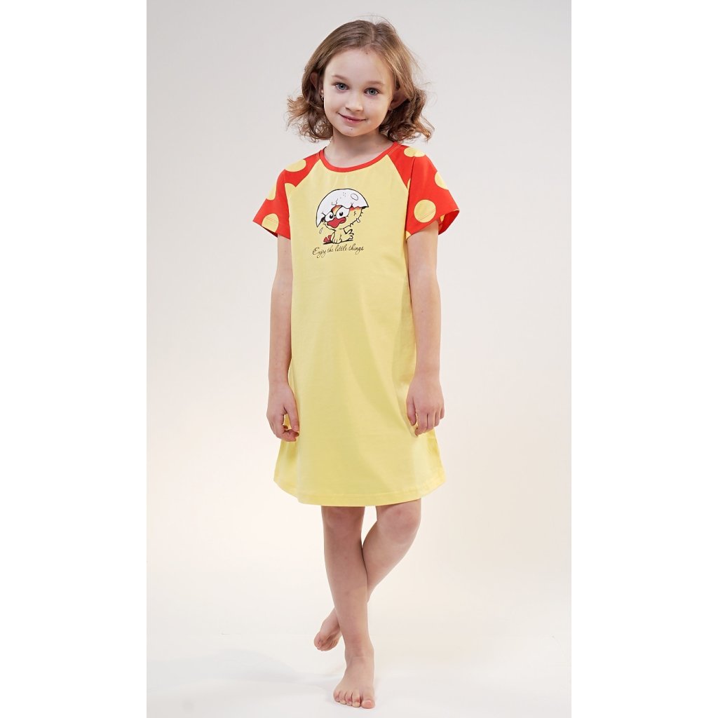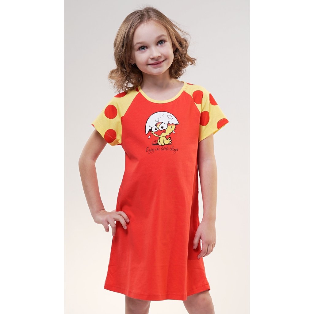 Dětská bavlněná noční košile s krátkým rukávem Kuře. Noční košilka má rukávky s velkými barevnými puntíky, na jednobarevném podkladu košile je obrázek roztomilého kuřátka se skořápkou na hlavě, pod kterým je nápis 'Enjoy the little things'. Použitý bavlněný materiál je příjemný a poddajný na dotek.
