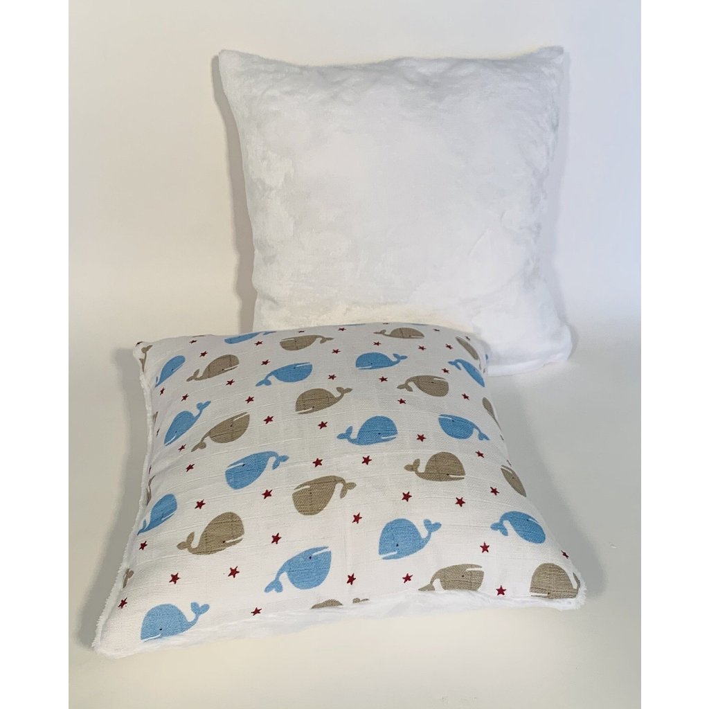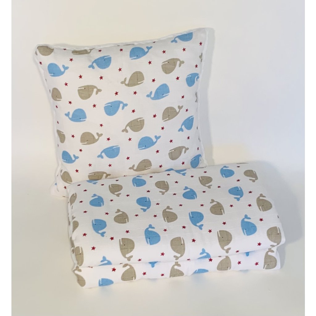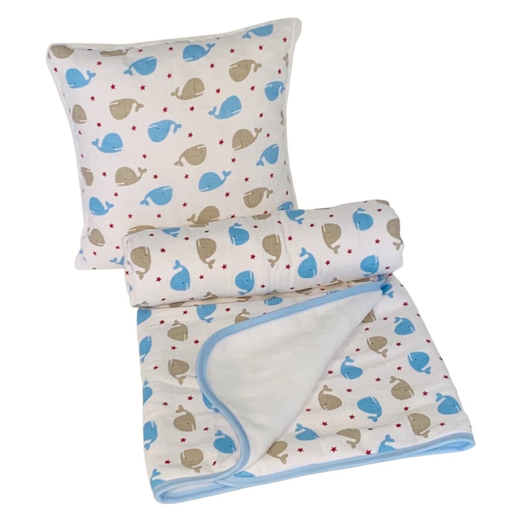 Dětská sada pro batolata s motivem modré a šedé velryby je ideální jak na spaní, tak na hraní na podlaze nebo do kočárku. Kombinuje jemné materiály pro maximální pohodlí a bezpečí dítěte. Souprava obsahuje polštářek o rozměru 35x35 cm a deku 90x100 cm.