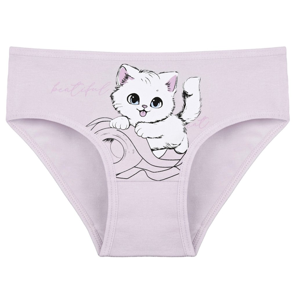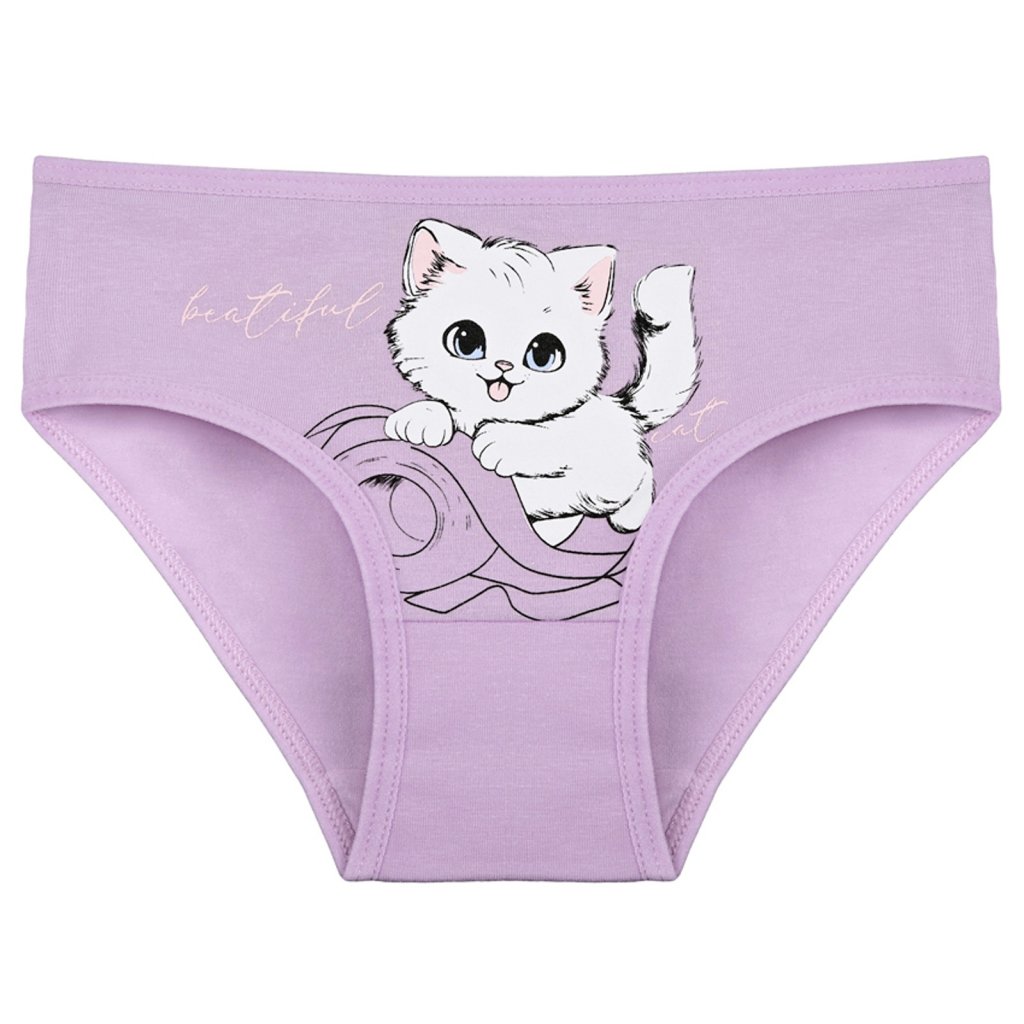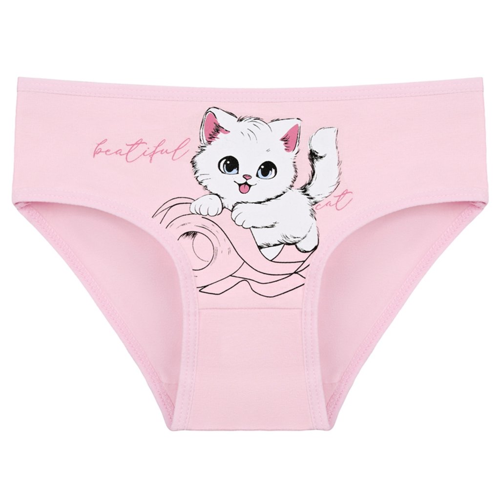 Dětské bavlněné kalhotky Kočička. Dětské kalhotky klasického střihu jsou pohodlné a slušivé, zdobí je obrázek kotěte. Obzvláště oceníte materiálové složení - 95% bavlna a 5% elasten. Použitý materiál je příjemný a poddajný na dotek.