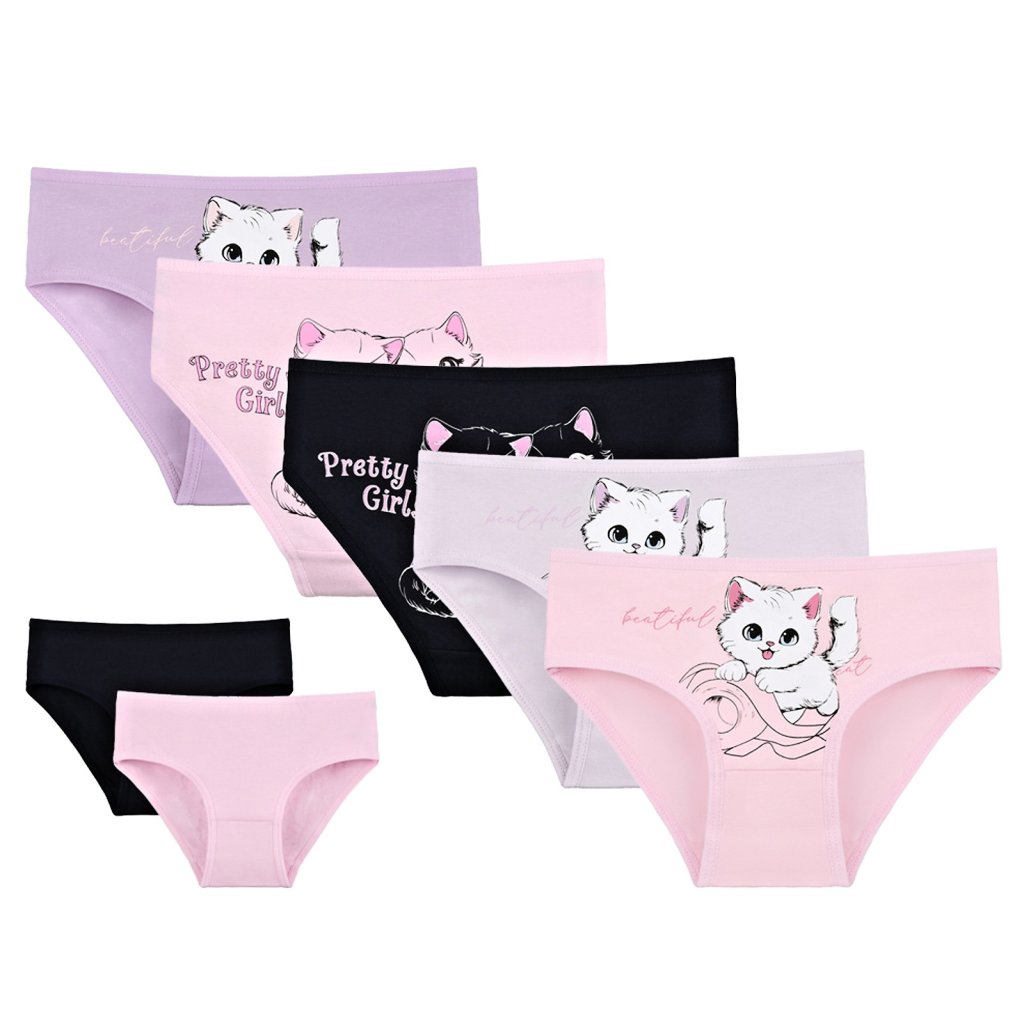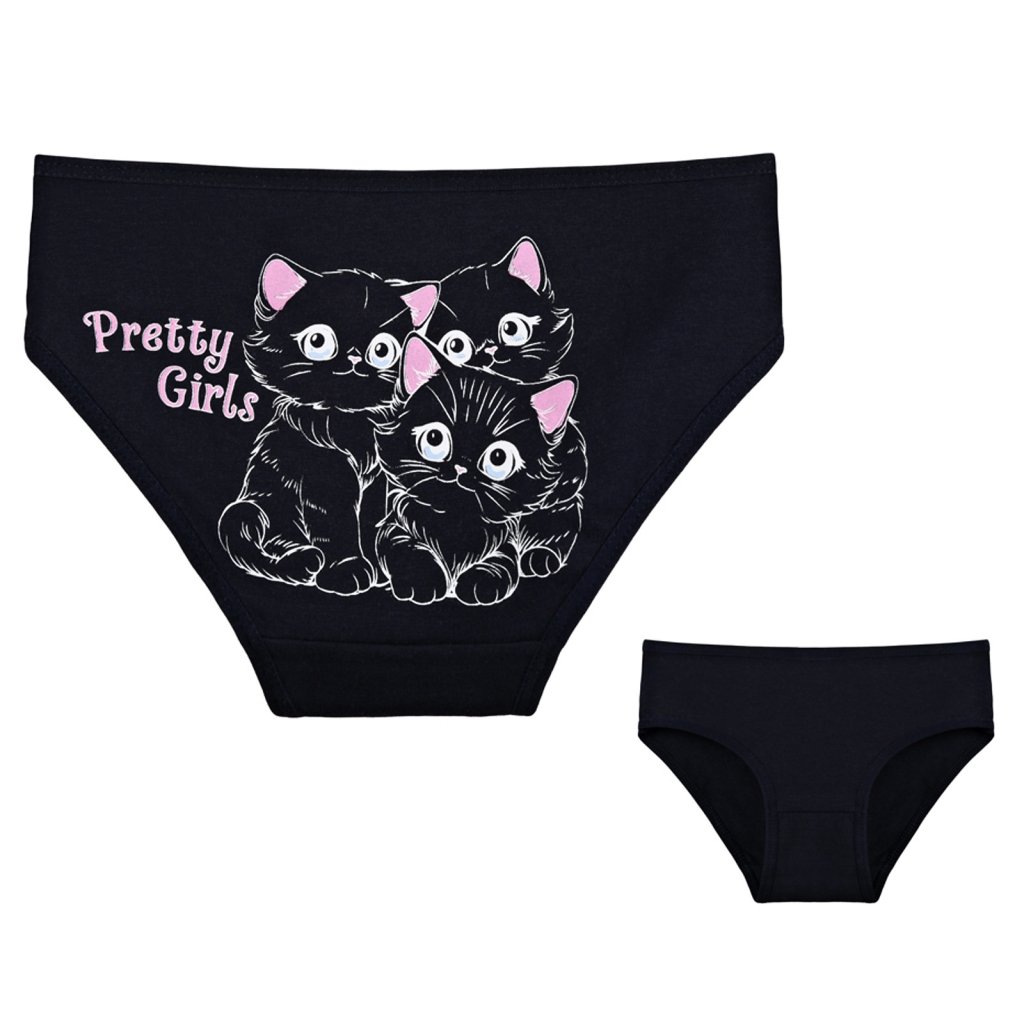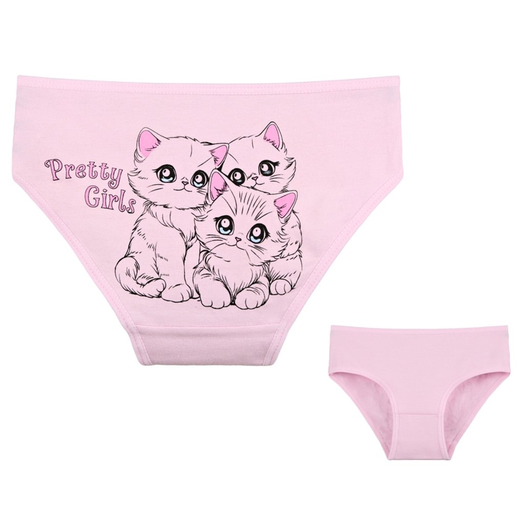 Dětské bavlněné kalhotky Kočička. Dětské kalhotky klasického střihu jsou pohodlné a slušivé, zdobí je obrázek kotěte. Obzvláště oceníte materiálové složení - 95% bavlna a 5% elasten. Použitý materiál je příjemný a poddajný na dotek.