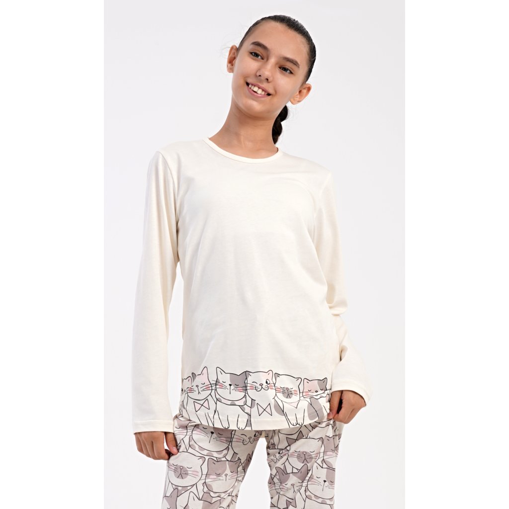 Dětské bavlněné dlouhé pyžamo Koťata. Dívčí pyžamo se skládá z trika s dlouhým rukávem a dlouhých kalhot. Triko s kulatým výstřihem je ozdobeno obrázky koček. Tento motiv se opakuje i na kalhotách, které mají v pase gumu a šňůrku na stažení, nemají kapsy. Použitý bavlněný materiál je poddajný a příjemný na dotek.