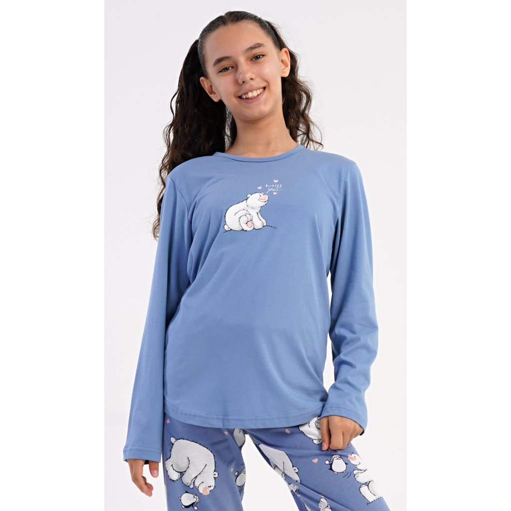 Dětské bavlněné dlouhé pyžamo Méďa a tučňák. Dívčí pyžamo se skládá z trika s dlouhým rukávem a dlouhých kalhot. Triko s kulatým výstřihem je ozdobeno obrázkem ledního medvěda. Tento motiv se opakuje i na kalhotách, které mají v pase gumu a šňůrku na stažení, nemají kapsy. Použitý bavlněný materiál je poddajný a příjemný na dotek.