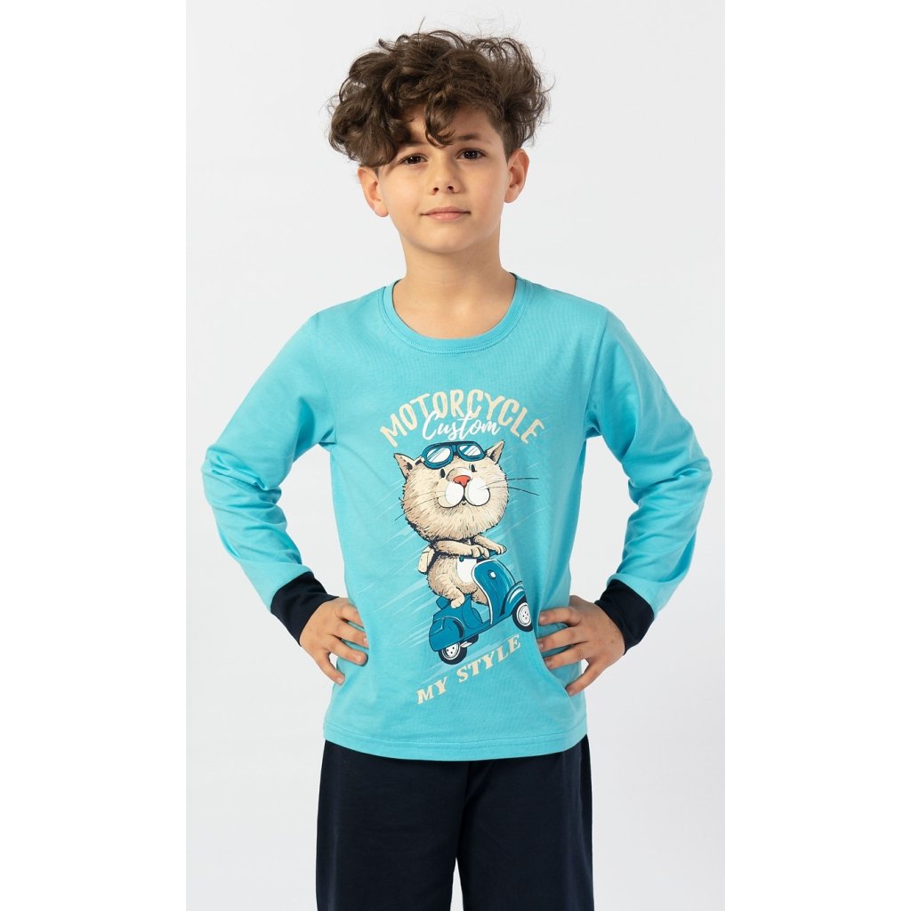 Dětské pyžamo dlouhé Motocycle. Dětské pyžamo se skládá z trika s dlouhým rukávem a dlouhých kalhot. Na triku je obrázek roztomilého kocoura řítícího se na Vespě, kolem kterého je nápis 'Motocycle custom - My style'. Rukávy trika a kalhot jsou zakončené panty. Kalhoty mají v pase gumu, nemají kapsy. Použitý materiál je příjemný a poddajný na dotek. Obsah bavlny u kalhot je 100%, u trika v tyrkysové barvě 100% a u šedého trika 70%.