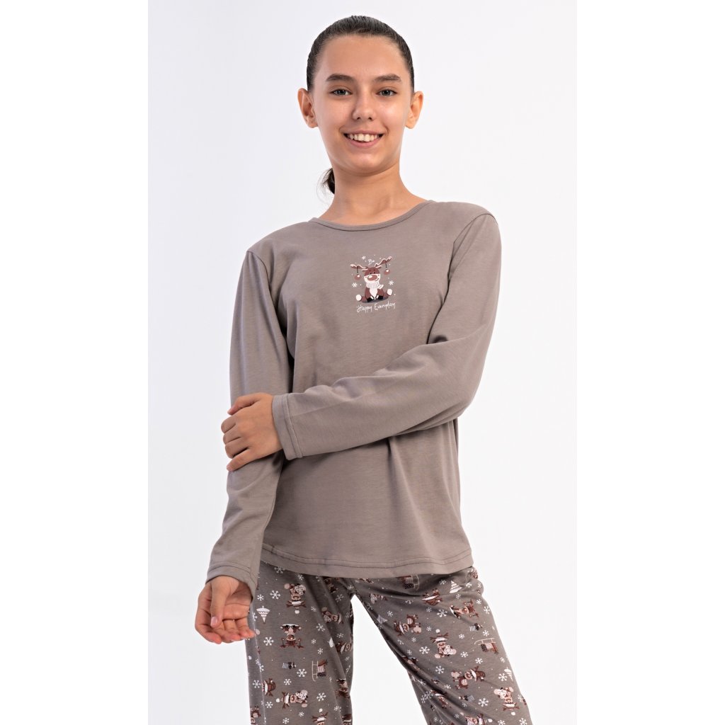 Dětské bavlněné dlouhé pyžamo Sobík. Dívčí pyžamo se skládá z trika s dlouhým rukávem a dlouhých kalhot. Triko s kulatým výstřihem je ozdobeno obrázkem malého vánočního soba. Tento motiv se opakuje i na kalhotách, které mají v pase gumu a šňůrku na stažení, nemají kapsy. Použitý bavlněný materiál je poddajný a příjemný na dotek.