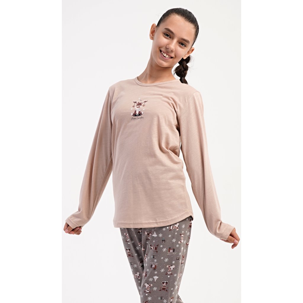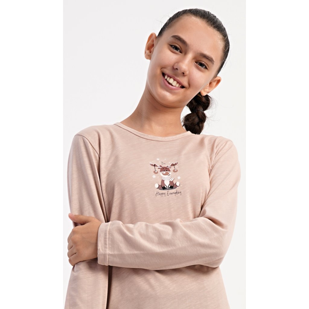 Dětské bavlněné dlouhé pyžamo Sobík. Dívčí pyžamo se skládá z trika s dlouhým rukávem a dlouhých kalhot. Triko s kulatým výstřihem je ozdobeno obrázkem malého vánočního soba. Tento motiv se opakuje i na kalhotách, které mají v pase gumu a šňůrku na stažení, nemají kapsy. Použitý bavlněný materiál je poddajný a příjemný na dotek.