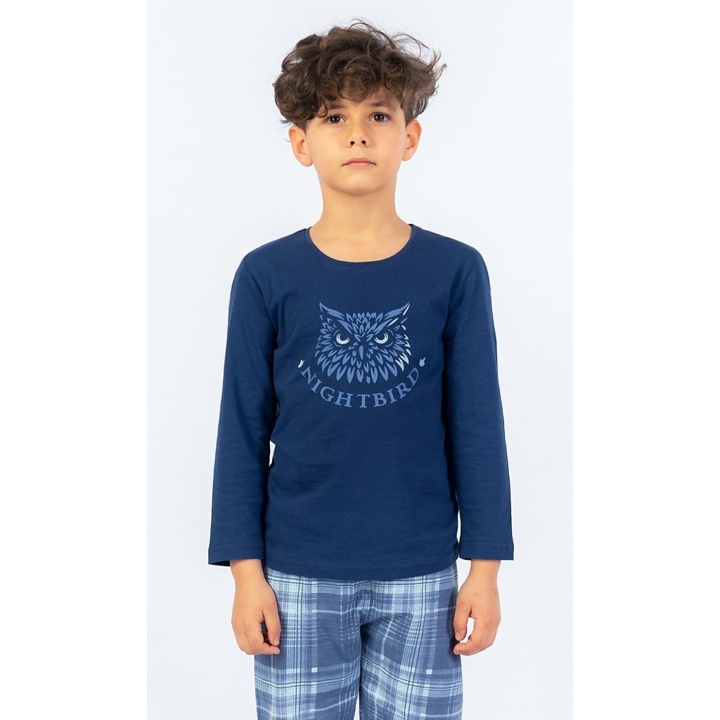 Dětské bavlněné pyžamo dlouhé Sova. Dětské pyžamo se skládá z trika s dlouhým rukávem a dlouhých kalhot. Na jednobarevném triku je obrázek soví hlavy s nápisem 'Nightbird'. Kostkované dlouhé kalhoty jsou zakončeny panty, mají v pase gumu a šňůrku na stažení, nemají kapsy. Použitý bavlněný materiál je příjemný a poddajný na dotek.