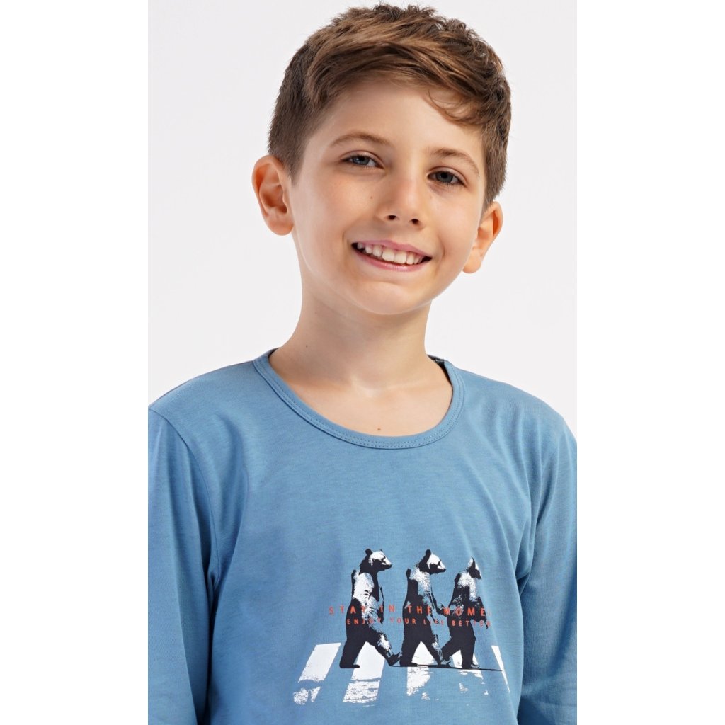 Dětské chlapecké bavlněné pyžamo Tobias. Pyžamo se skládá z trika s dlouhým rukávem a dlouhých kalhot. Triko s kulatým výstřihem zdobí obrázek tří medvědů na přechodu. Jednobarevné dlouhé kalhoty mají v pase gumu a šňůrku na stažení, jsou bez kapes. Použitý bavlněný materiál je příjemný a poddajný na dotek.
