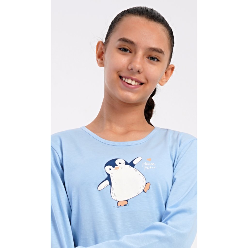 Dětské bavlněné dlouhé pyžamo Tučňák. Dívčí pyžamo se skládá z trika s dlouhým rukávem a dlouhých kalhot. Triko s kulatým výstřihem je ozdobeno obrázkem tučňáka. Tento motiv se opakuje i na kalhotách, které mají v pase gumu a šňůrku na stažení, nemají kapsy. Použitý bavlněný materiál je poddajný a příjemný na dotek.