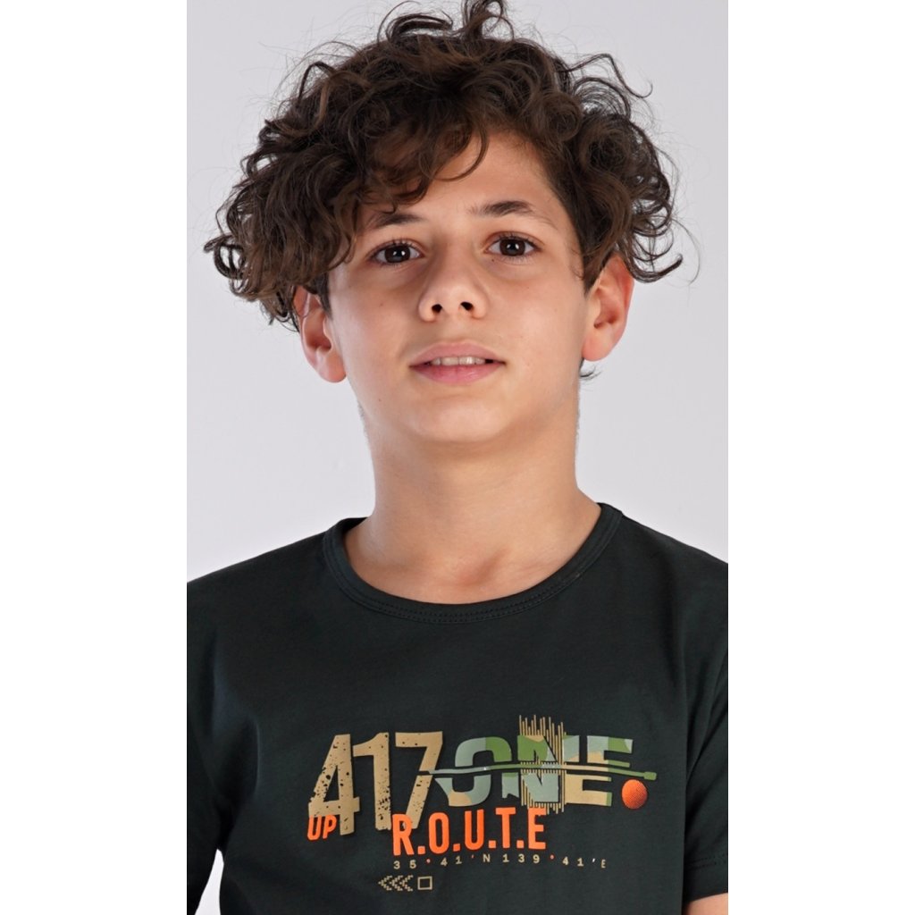 Dětské bavlněné pyžamo kapri Army. Dětské pyžamo se skládá z trička s krátkým rukávem a tříčtvrtečních kalhot. Na jednobarevném tričku s kulatým výstřihem je nápis '417 one route'. Maskáčové kapri kalhoty mají v pase gumu, nemají kapsy. Použitý bavlněný materiál je příjemný a poddajný na dotek.