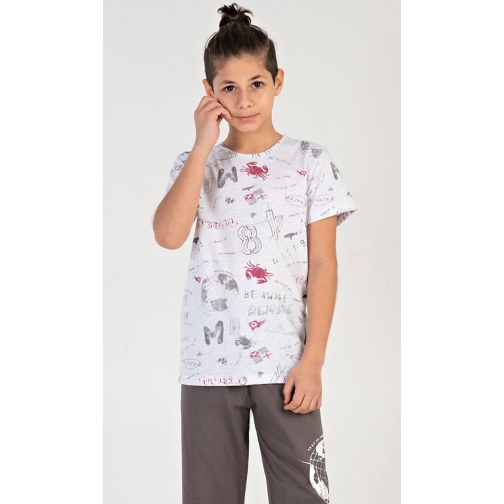 Dětské chlapecké kapri pyžamo Kuba. Dětské pyžamo se skládá z trička s krátkým rukávem a tříčtvrtečních kalhot. Tričko je potištěno motivy moře a cestování. Jednobarevné kapri kalhoty mají v pase gumu, nemají kapsy. Použitý bavlněný materiál je příjemný a poddajný na dotek. Obsah bavlny u trička je 70% a u kalhot 100%.