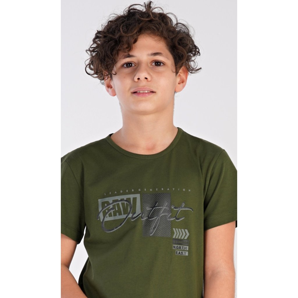 Dětské bavlněné pyžamo šortky Raw. Dětské pyžamo se skládá z trička s krátkým rukávem a krátkých kalhot. Tričko s kulatým výstřihem zdobí nápisy v army stylu, tento motiv je použit i na šortkách. Šortky mají v pase gumu, jsou bez kapes.