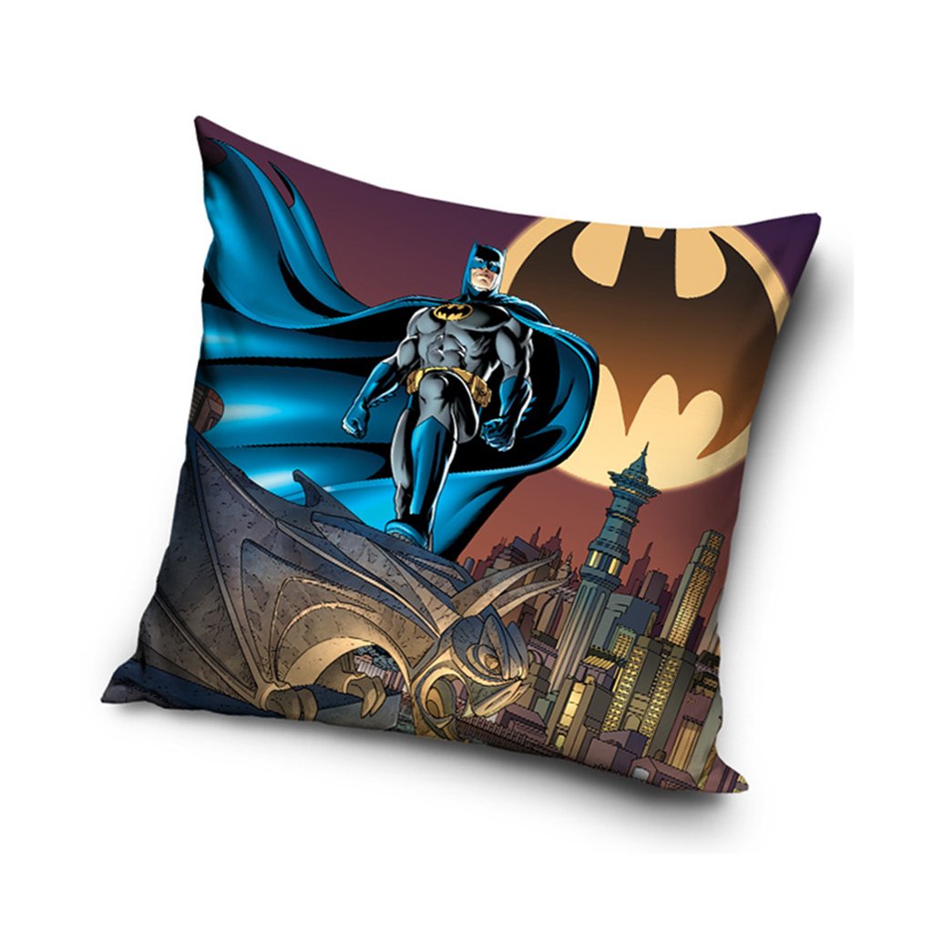 Na obou stranách polštářku je stejný, výrazný komiksový motiv Batmana, který stojí na střeše svého města s rozvinutým pláštěm a dohlíží na noční Gotham City