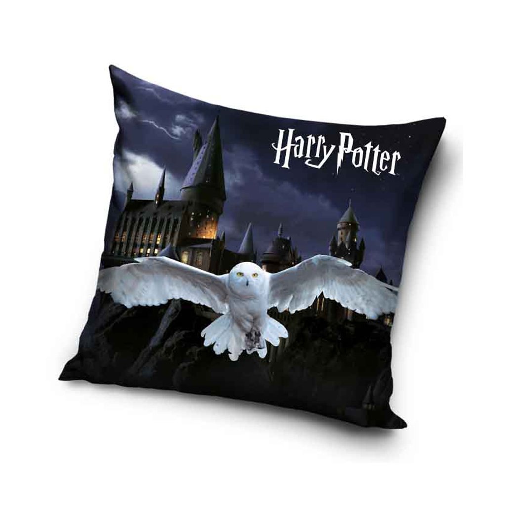 Vzor polštářku zachycuje ikonickou sovu Hedviku, která se vznáší s roztaženými křídly před temnou noční siluetou Bradavického hradu