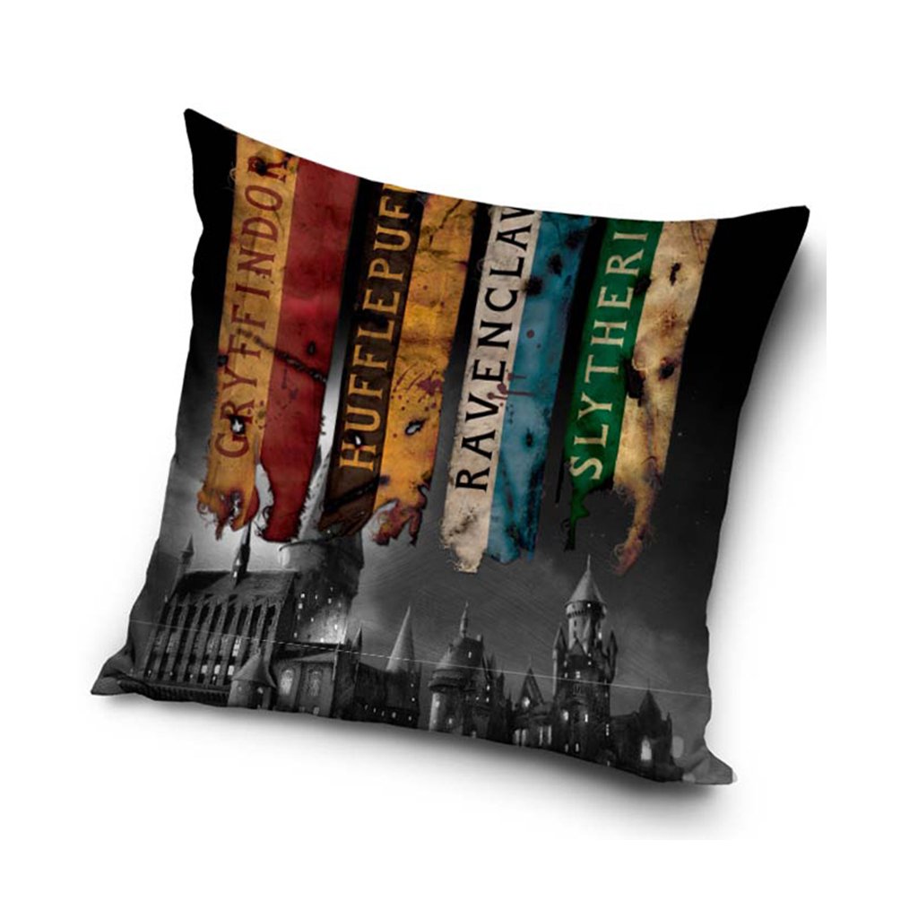 Luxusní polštářek Harry Potter s vlajkami kolejí a magickou atmosférou Bradavic