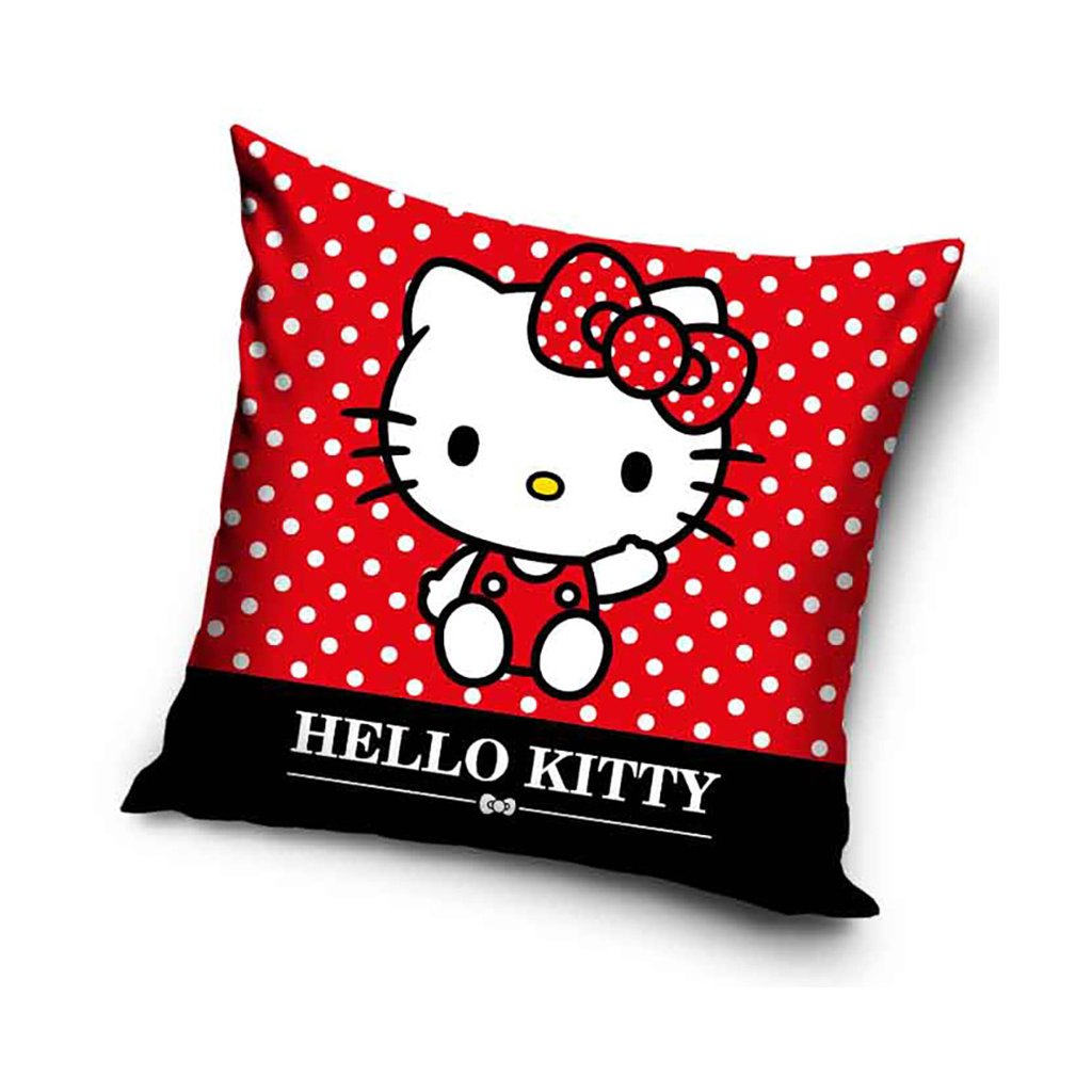 Přední i zadní stranu polštářku zdobí ikonický motiv Hello Kitty v roztomilé sedící pozici, s její typickou červenou mašlí, která dokonale ladí s celým designem Pozadí tvoří výrazná červená plocha posetá bílými puntíky, díky nimž motiv působí hravě, svěže a nadčasově
