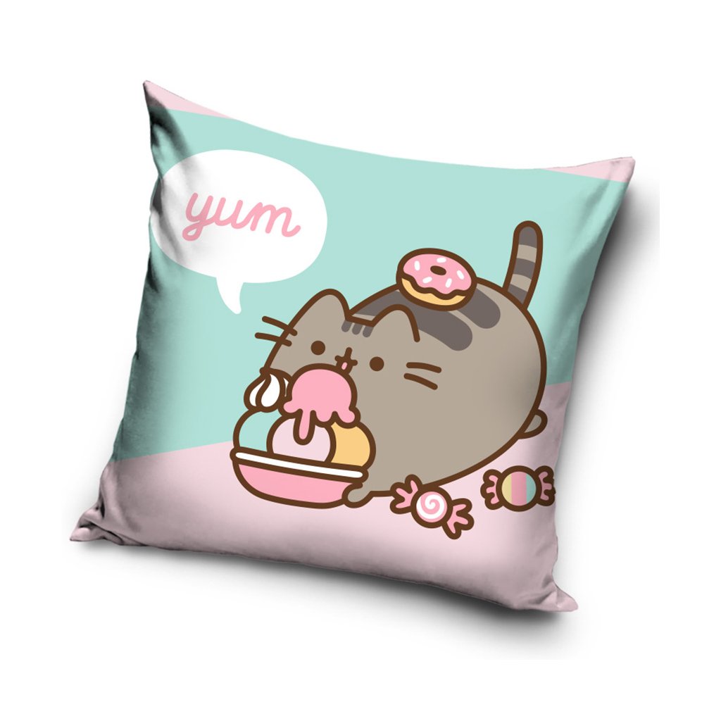 Na obou stranách polštářku je stejný motiv roztomilé kočičky Pusheen, která si s chutí dopřává svou oblíbenou svačinku – sladkou koblihu a zmrzlinu