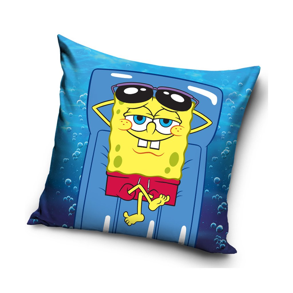 Na obou stranách polštářku je stejný veselý motiv SpongeBoba, který se opaluje a relaxuje na modrém lehátku v moři