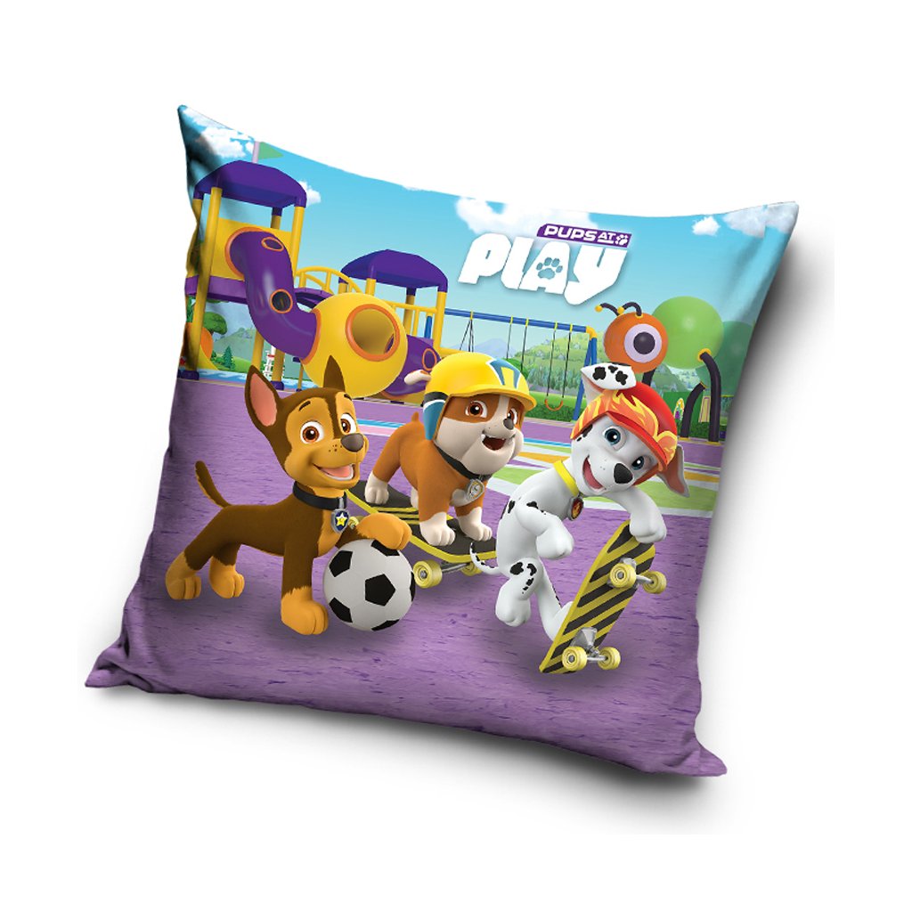 Na horní části polštářku je výrazný nápis „Pups at Play“, který dokonale vystihuje dětskou energii a týmového ducha hrdinů z Adventure Bay