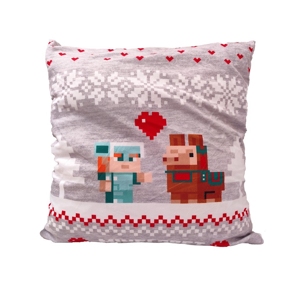 Na šedém polštářku jsou kostičkované postavičky z oblíbené počítačové hry Minecraft