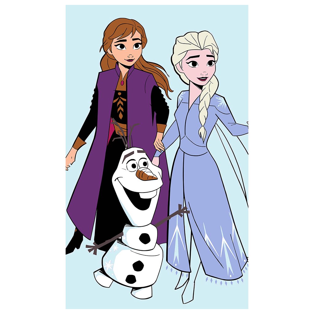 Na přední straně světle modrého ručníčku je Anna, Elsa a veselý sněhulák Olaf