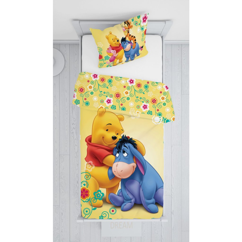 Povlečení je vyrobeno z kvalitního a měkkého materiálu, který zajišťuje pohodlný a klidný spánek vašeho dítěte. Na povrchu povlečení se nachází veselý obrázek Medvídka Pů, který sedí vedle svého kamaráda Ijáčka, zatímco Tygřík a Prasátko stojí v pozadí. Celkový design je doplněn barevnými květinovými vzory na žlutém podkladu, což dodává povlečení hravý a přátelský vzhled.