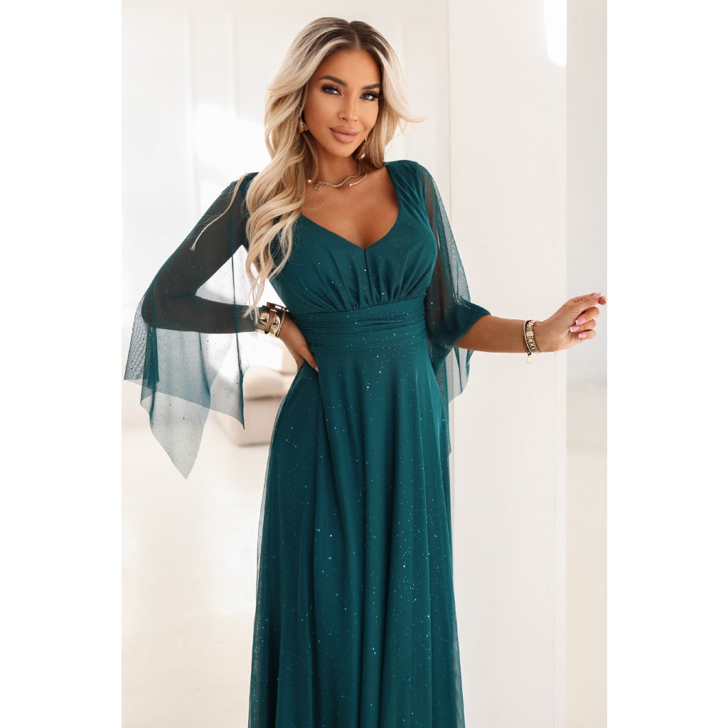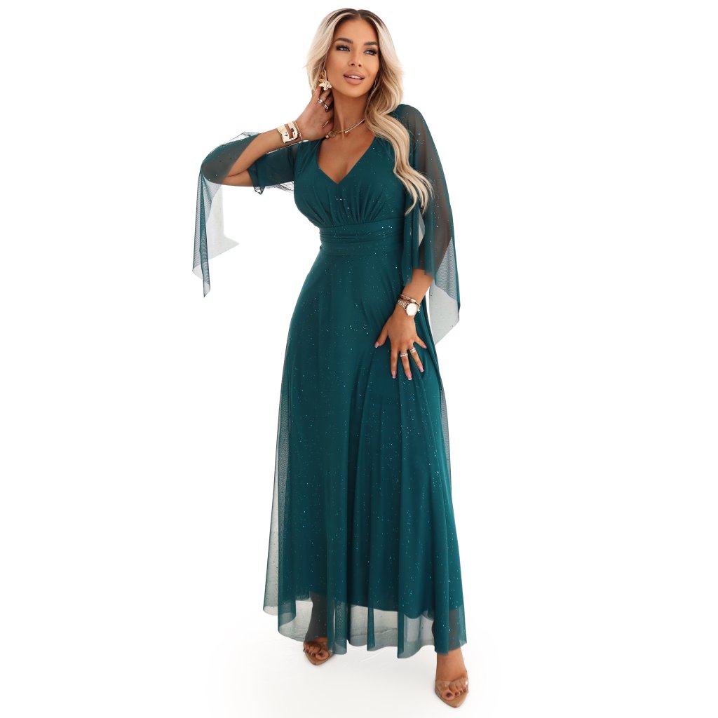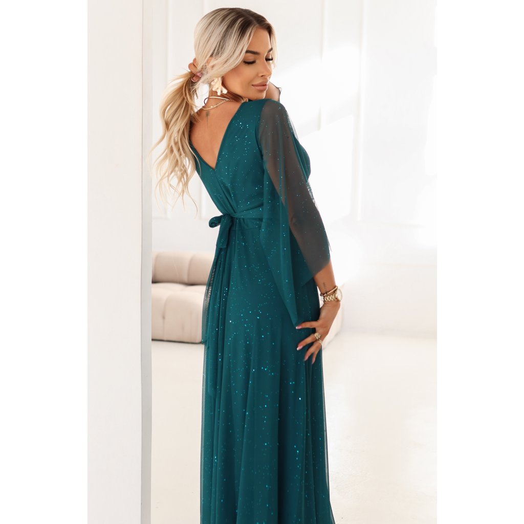 Dlouhé, třpytivé šaty s hlubokým výstřihem a průsvitnými rukávy - smaragdově zelené 655-2