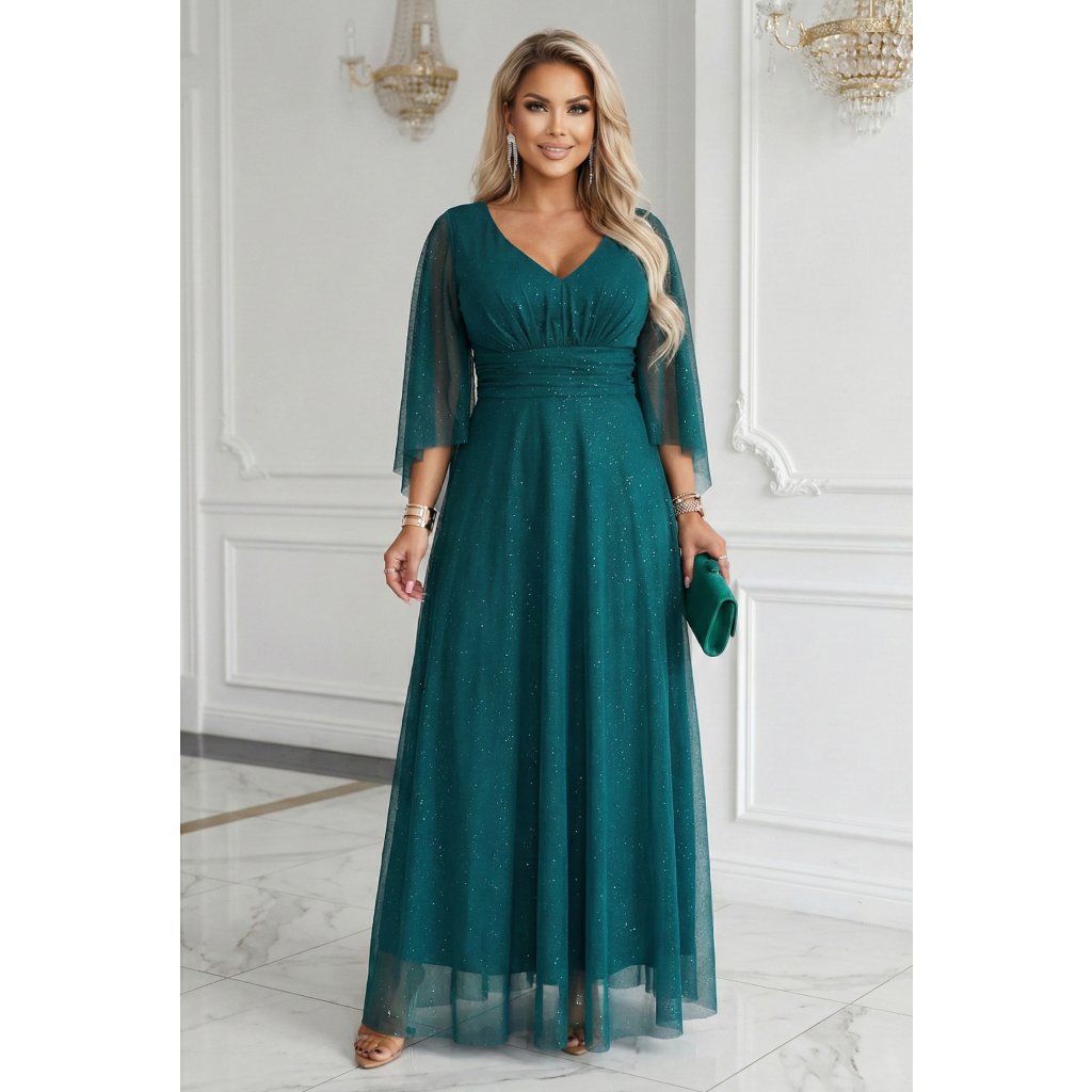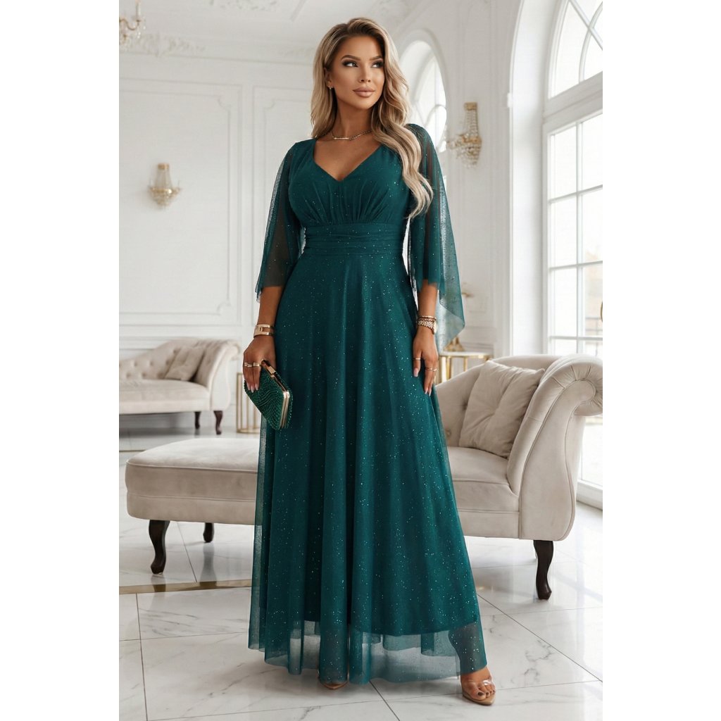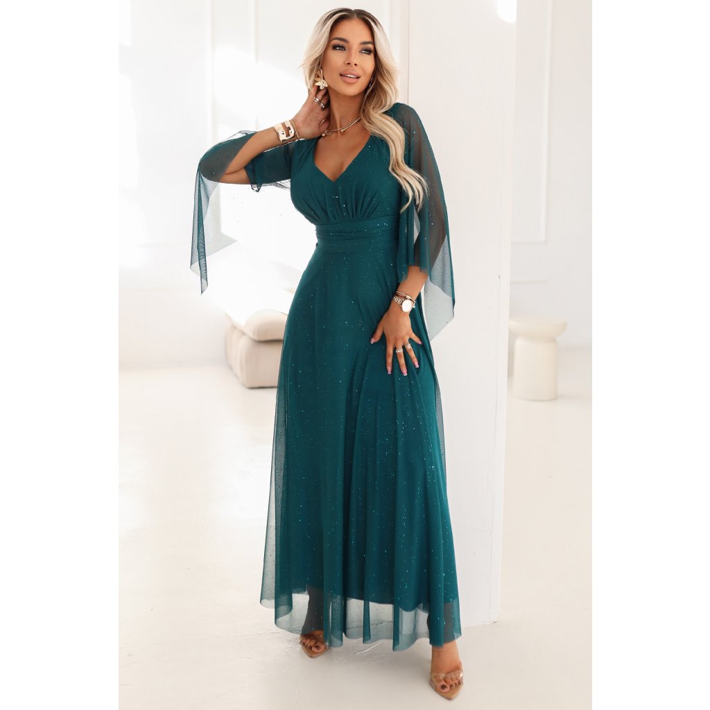 Dlouhé, třpytivé šaty s hlubokým výstřihem a průsvitnými rukávy - smaragdově zelené 655-2