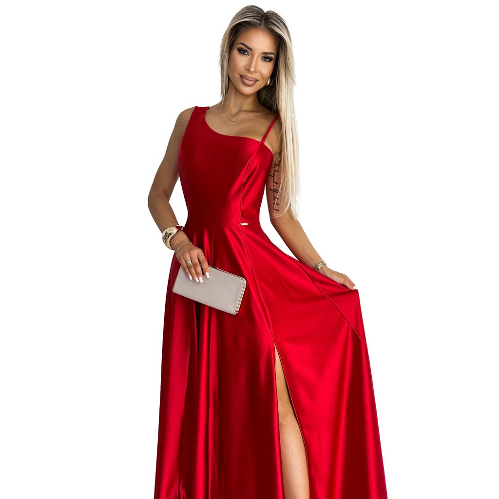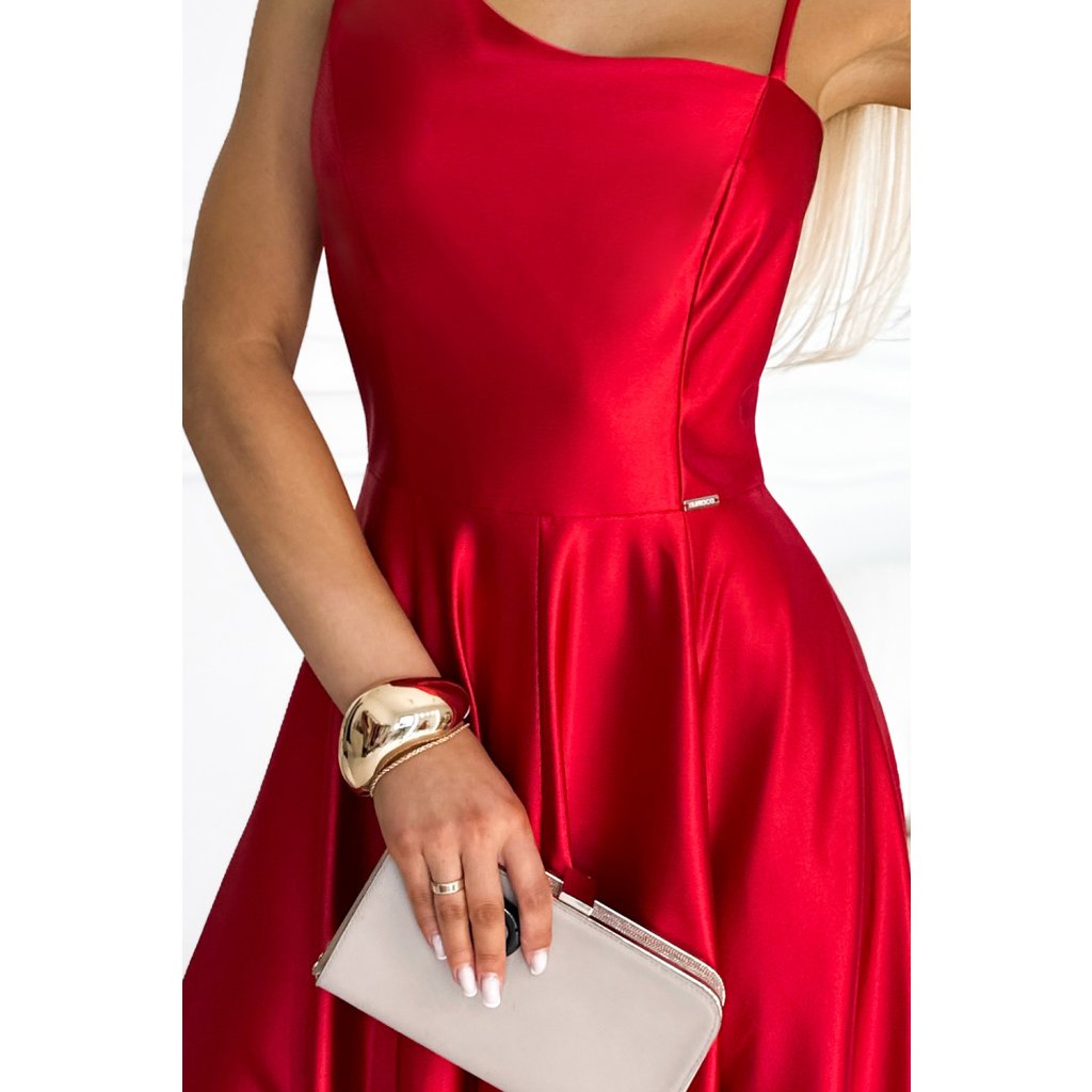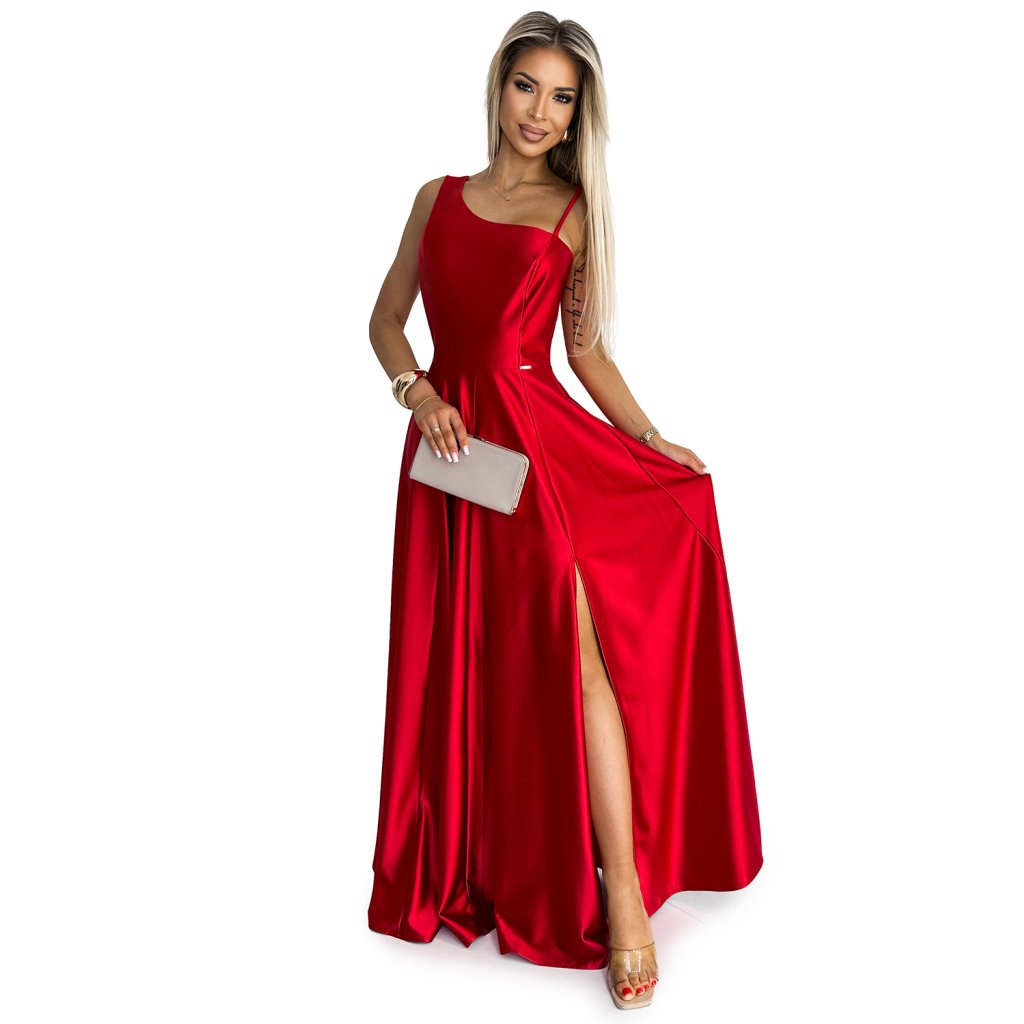 Elegantní maxi dlouhé saténové šaty s jedním ramenem. Vyrobeno z lesklého, hladkého, lehce elastického červeného saténu. Šaty ideální na svatby, Silvestra, ples, karneval a další významné příležitosti. Polská výroba. Značka Numoco.