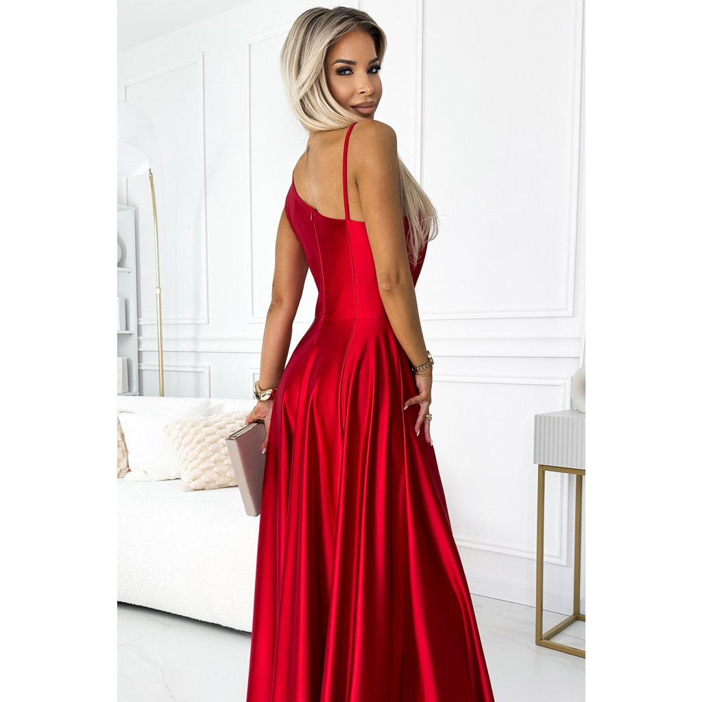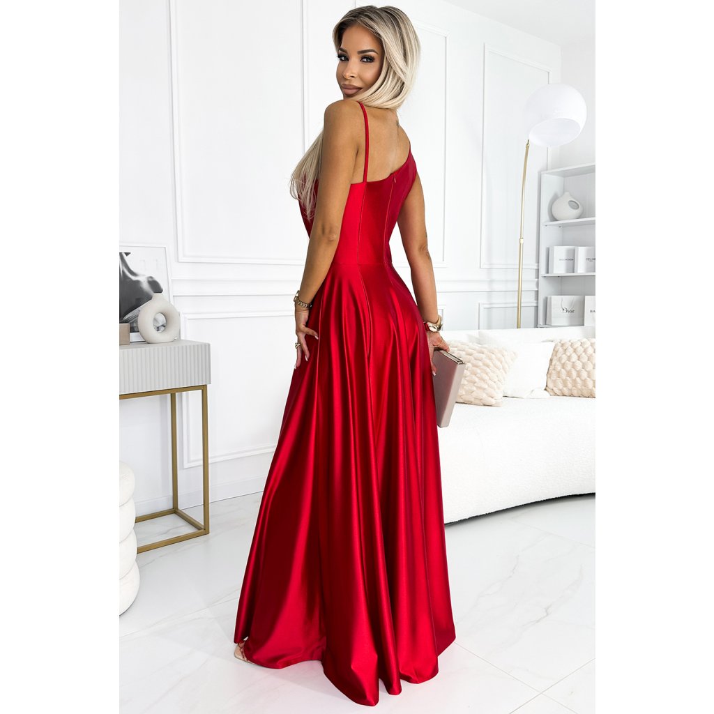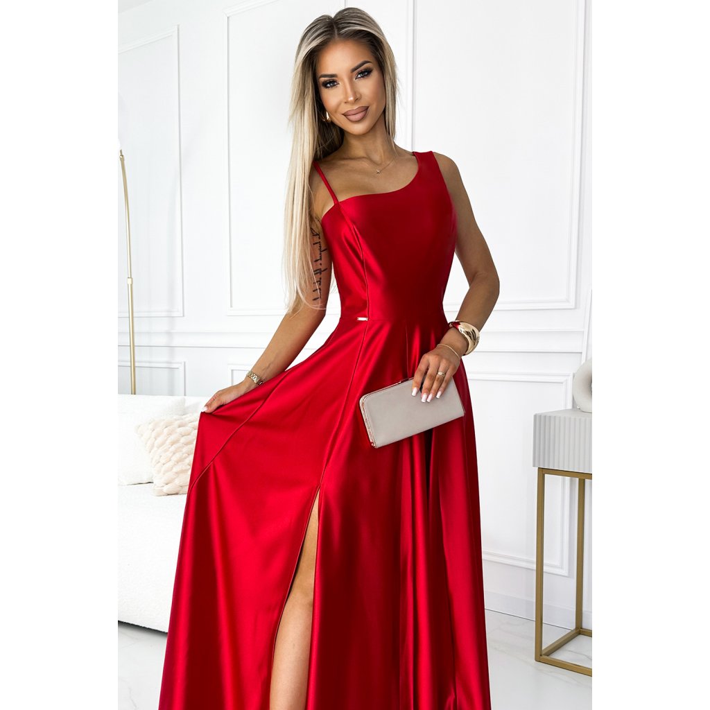 Elegantní maxi dlouhé saténové šaty s jedním ramenem. Vyrobeno z lesklého, hladkého, lehce elastického červeného saténu. Šaty ideální na svatby, Silvestra, ples, karneval a další významné příležitosti. Polská výroba. Značka Numoco.