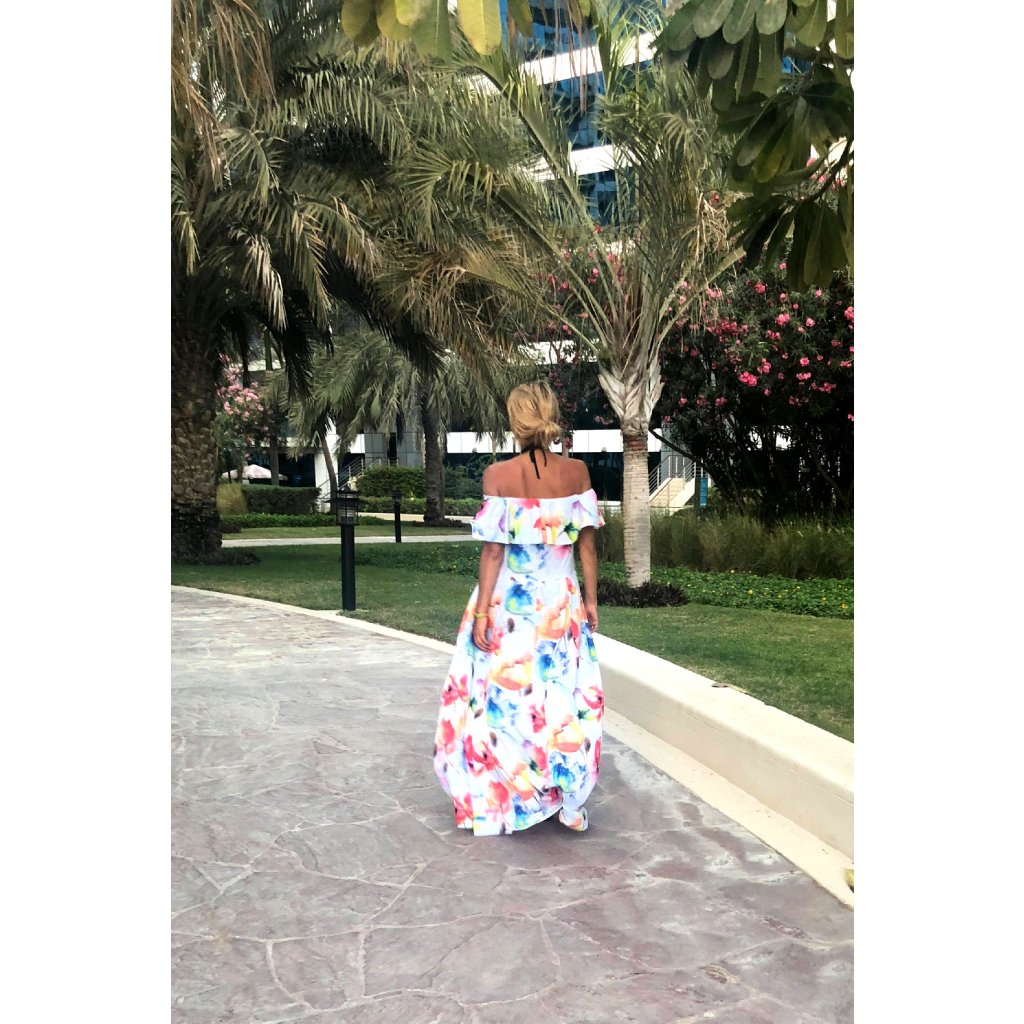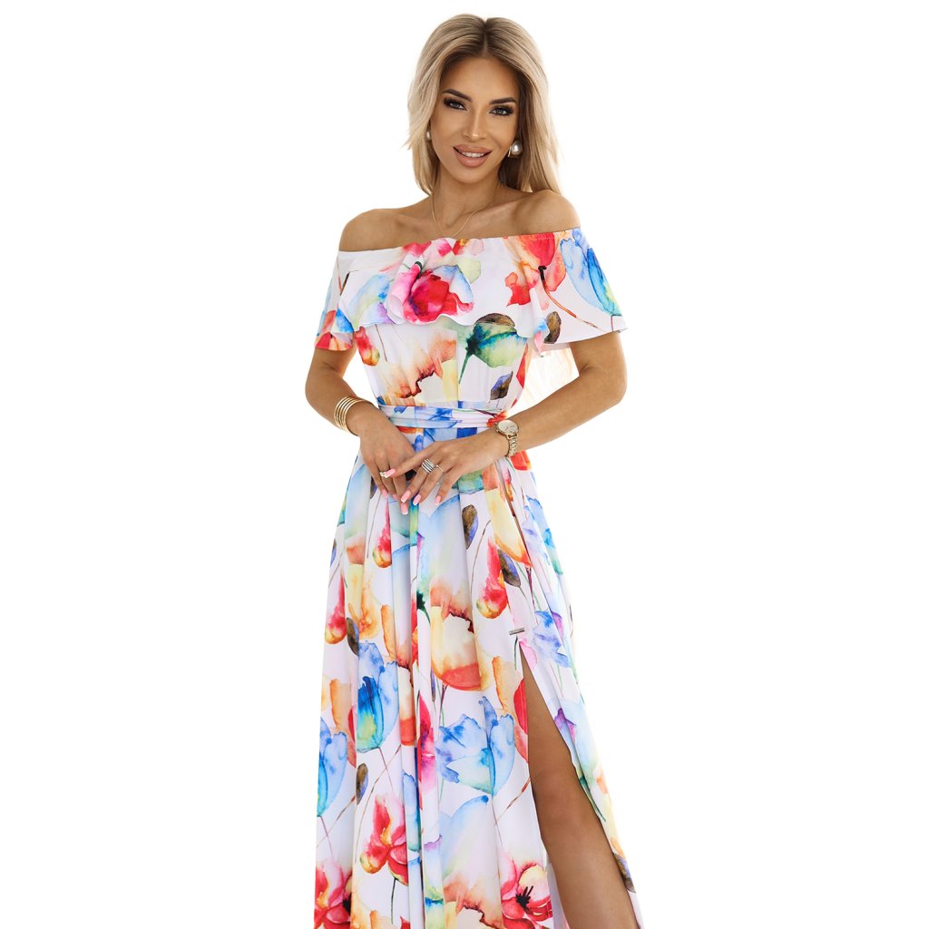☀️ Pociťte letní lehkost a romantický styl s našimi dlouhými španělskými šaty! Volán zvýrazňuje ramena a efektní rozparek na nohavicích dodává na smyslnosti. Model je doplněn páskem, který krásně zvýrazňuje pas. Šaty potěší vzorem velkých, malovaných barevných květů, ? vytvářející jedinečný vzhled ideální na dovolenou, letní párty nebo romantické večery. ?? Polský výrobek. Značka Numoco.