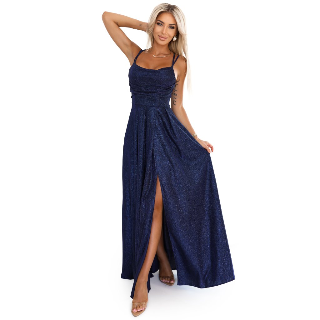 Dlouhé třpytivé večerní šaty s rozparkem a korzetetním šněrováním na zádech – námořnicky modré
