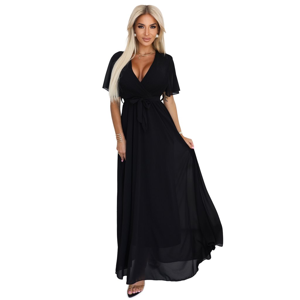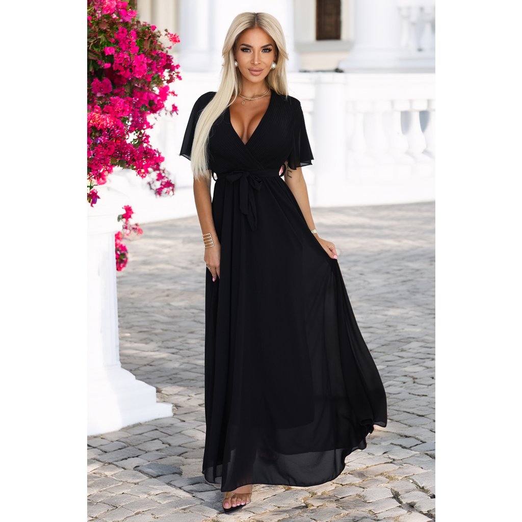 Stylové a ženské maxi šaty v klasické černé barvě jsou ideálním návrhem pro výjimečné příležitosti. Horní část je efektně dokončena plisovaným zavinovacím výstřihem, který jemně podtrhuje poprsí a dodává siluetě lehkost.